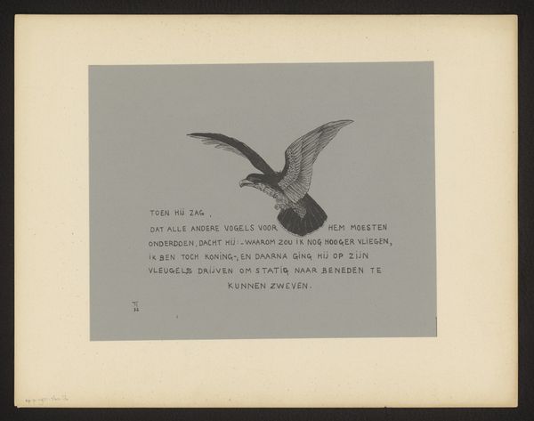 Editor: This etching, "Le Canard," created by Félix Bracquemond in 1856, captures a duck in flight. The composition, with the duck centered and wings spread, creates a powerful, dynamic effect, as does the dark ink of the bird. How should we understand the organization of elements and textures in this print? Curator: Consider the relationship between the etched line and the forms they define. Bracquemond's etching technique demonstrates remarkable control, modulating the depth and density of the lines to suggest depth, light, and texture. Note the contrast between the dense, detailed rendering of the duck and the more gestural depiction of the landscape below. What does this suggest? Editor: Maybe the contrast directs the viewer's attention to the animal? Or perhaps Bracquemond wants us to feel the difference between being at ground level or being airborne like the animal? Curator: Precisely. Focus is emphasized by contrasts within the image, so there is the interplay between foreground and background, texture and negative space. How does the print medium affect the work? Editor: Well, printmaking offers precision but is more about repeated forms. Is there tension in the work between natural forms, that bird for instance, versus this mechanical reproduction of the printing process? Curator: An astute observation. Consider, finally, how Bracquemond leverages the inherent qualities of the etching process – its capacity for detailed line work, subtle tonal gradations, and reproducible imagery – to construct a compelling formal arrangement. These formal elements combine to create the image before us. Editor: So, by examining the lines, the forms, and their relation, we find the aesthetic value in Bracquemond's image, even before asking what it is "about." Curator: Precisely. Sometimes, seeing is truly believing, at least formally.