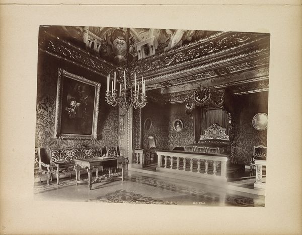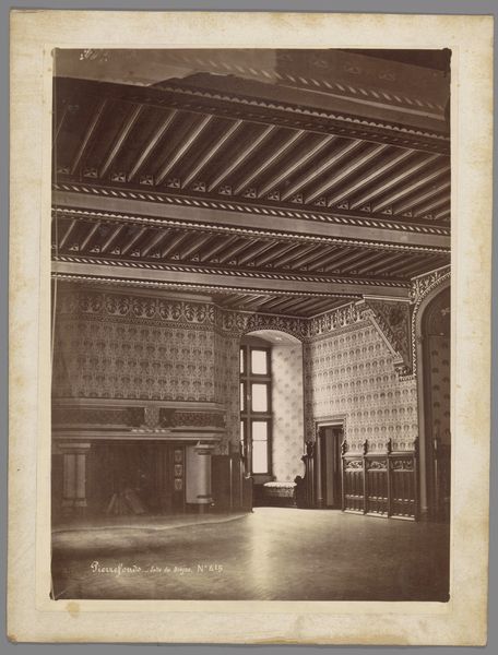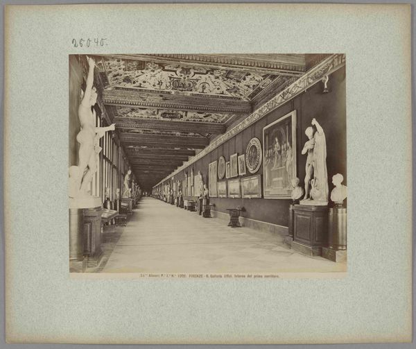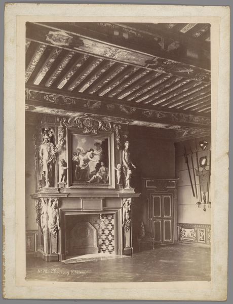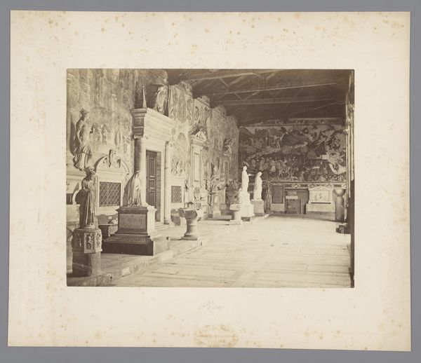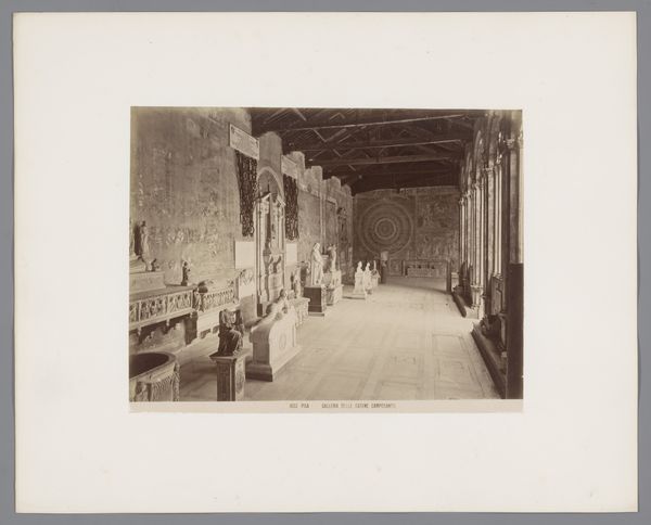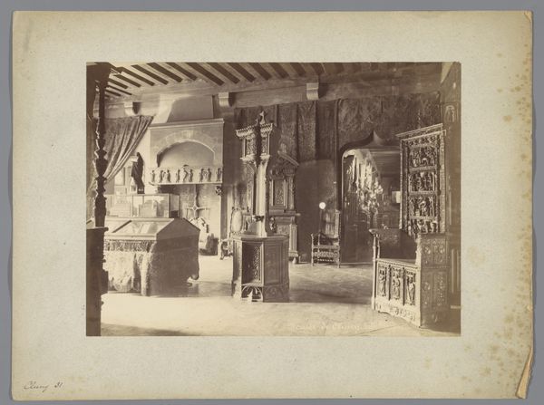 Curator: Look at this stately image captured sometime between 1850 and 1900, taken by Médéric Mieusement. Titled "Zaal in het Musée de Cluny te Parijs," this albumen print currently resides in the Rijksmuseum. Editor: My initial feeling is of a cavernous emptiness, punctuated by the rigid geometry of the objects. The monochromatic palette only amplifies this austerity. Curator: Austerity, yes, but consider the Musée de Cluny itself, dedicated to medieval art and artifacts. Each object, even captured in this photograph, acts as a symbol. Those sculptures, tapestries glimpsed in the background—each embodies centuries of cultural and religious meaning. They serve as tangible links to a world vastly different, yet fundamentally connected, to our own. Editor: I concede the implied narratives are present. Yet I'm drawn to how Mieusement frames the space. Note the lines – the receding herringbone pattern of the floor, the parallel benches, all leading the eye toward a vanishing point within the shadowed depths of the room. It's a deliberate orchestration of perspective. Curator: And isn't perspective itself a symbol here? This photograph isn't merely a depiction of space; it represents a particular 19th-century gaze upon the medieval past. It’s a selection, an interpretation. It speaks of a desire to contain and understand history through the lens of modernity. Even the seemingly random arrangement of objects communicates something about the curatorial decisions made at the time, imbuing it with secondary meaning. Editor: Indeed, and speaking of lenses, it's amazing what clarity has been captured within. How the contrast helps bring forward some shapes to the eye. It truly underscores your initial idea: How the objects contain our collective visual culture. Curator: Precisely. This photograph isn't just a document; it's a meditation on how we construct and preserve cultural memory. Editor: A perspective that shifts as light plays upon form, a quiet dialogue of geometric spaces housing stories that speak to humanity across the ages.