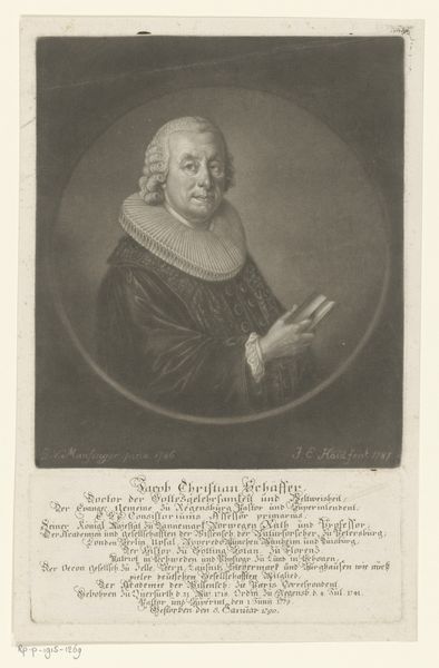 Editor: This is Johann Elias Haid's "Portret van Johann Rudolf Ulrich," made between 1749 and 1809. It's an engraving, currently held at the Rijksmuseum. I’m struck by the intricate lines and the stark contrast. It feels very formal and restrained. How do you approach analyzing this kind of portrait? Curator: Well, focusing on the formal aspects, notice the artist's use of line. It’s incredibly precise and controlled. Look at how it defines the contours of the face and the intricate folds of the ruff. The use of tonal gradations creates volume and depth. What is the effect of this limited palette? Editor: It definitely contributes to the somber, almost severe mood. It highlights the textures, especially in the wig and the ruffled collar. I also noticed the oval frame and the rectangular base. Why these geometric choices? Curator: Precisely! These shapes create a sense of structure and order. The oval softens the square, and contrasts the naturalism of the portrait, reinforcing the sitter’s importance without sentimentalism. Note also the inscriptions in Latin - their position and relation to the sitter’s face. How does that direct your reading? Editor: I see. It adds another layer of formality and almost elevates the sitter. The engraving really highlights how light reflects off certain parts of the face, creating more emphasis on the importance of that person. It's interesting how the artist made such formal choices. Curator: Absolutely, through precise rendering, defined form, tonal arrangement and calculated placement, the image invites you to see beyond just a record to appreciate compositional and stylistic sophistication. Editor: This has highlighted new avenues of exploration that will definitely benefit my analytical skills. Thank you!
