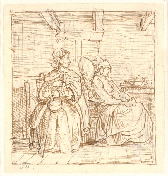 Curator: This delicate drawing, "Two Girls, One Seated, the Other Dressing her Hair," comes to us from a British School artist of the 19th century. It's a small work, just over 10 cm square. Editor: It's strikingly intimate. The sepia ink gives it a feeling of aged memory, like a glimpse into a private moment. Curator: Indeed. The act of hair dressing has been laden with significance cross-culturally. Here, it’s about intimacy and the rituals of feminine beauty. Note the downcast eyes of the seated woman, perhaps a symbol of introspection. Editor: And what about the material conditions of its creation? What sort of paper, the specific ink formula—these details shape the work. Curator: Precisely! The line work, achieved by that very ink on likely handmade paper, suggests a specific class, education, and access to materials. Editor: It speaks to the labor and the access to materials inherent in the artist’s station. I wonder what the artist intended for its consumption. Curator: I agree. The symbolism and materials both reflect the artist’s world. It's a powerful reminder of how much context is woven into even the simplest sketch. Editor: It invites contemplation on both its visual language and its tangible presence.