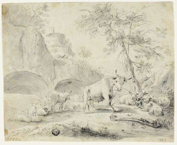 Editor: This is "Landschap met schaapherder en zijn kudde," or "Landscape with Shepherd and his Flock" by Pieter de Goeje, dating from between 1789 and 1859. It's an etching, rendered in delicate lines of sepia ink. It feels very pastoral, quite tranquil, but almost to a fault. It makes me wonder what the story here is... what do you see in it? Curator: Immediately, the strength of this work lies in its meticulous line work. De Goeje’s technique here invites contemplation on form. How would you describe the interplay between the shepherd, the sheep, and the landscape? Editor: I'm struck by how the landscape seems to echo the rounded forms of the sheep, while the shepherd is this very sharp, angular form on the other side. It creates this dichotomy between nature's softness and, I don't know, civilization's...sharpness? Is that reaching too far? Curator: Not at all. The opposition you noted serves as a visual device. Semiotically, we may decode the shepherd as the disruptor of nature's equilibrium or the agent who orders its elements. Notice, also, the almost monochrome palette. What effect does it produce, and what purpose does it serve? Editor: Well, it definitely flattens the image. It's not realistic, in that sense. But maybe the limited tonal range emphasizes the shapes themselves, their texture and their relations rather than the realistic colors of the land. It almost feels… conceptual? Curator: Precisely. De Goeje subverts a purely representational reading, privileging formal relationships within the composition. The material, etching, inherently emphasizes the graphic structure. Note the relationship between foreground and background. Do the hill or mountain appear distant? Editor: No, they're rendered with the same sharpness of line, but are much less focused-on than the Sheep and Shepard in the very front. That equal weight almost undermines any sense of spatial depth. The interplay you are showing me here is really well put together! Curator: Indeed. The artwork challenges conventional perspective. The material qualities are not divorced from content; it makes you realize that line can represent any boundary to thought as a limitation of our gaze on things, if the lines in this plate have a will to see or not to see certain things. The artist chose an important technique. Editor: I never thought of it that way. So it's less about representing reality and more about exploring form and line itself? I'll keep that in mind next time.