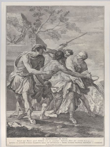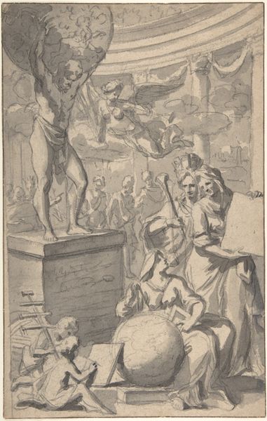 Editor: This is Januarius Zick's "Enthauptung Johannes des Täufers," or "Beheading of John the Baptist," a drawing made around 1755 with ink and gouache on paper. It's rather grim, naturally. All the figures seem caught in this terrible moment. What do you see in terms of its history? Curator: The image, steeped in the visual language of the Baroque, reflects a recurring fascination within religious and political spheres with power, sacrifice, and martyrdom. It depicts a specific biblical narrative but it also speaks to broader concerns regarding authority and its often brutal exercise. The use of the grisaille technique—executed solely in shades of gray—invokes a somber mood appropriate to the subject. What kind of a public impact would art such as this have during the 18th century? Editor: I guess in a society where religion was much more central to everyday life, it would be a potent reminder of religious and moral expectations, or maybe warnings. Do you think that explains its popularity at the time? Curator: Exactly. Religious works like this, particularly those displayed in public spaces like churches or even reproduced as prints, served as visual tools for moral instruction, reinforcing social norms and power structures. The graphic nature of the beheading forces the viewer to confront uncomfortable truths about justice, faith, and obedience, further emphasizing the didactic function. And the patron of the piece, as well as the display context, shapes how these ideas are presented. How might its message change in a different time? Editor: That’s interesting to consider. Nowadays, in a museum, it’s more of a historical artifact and the message is somewhat diminished but allows us to look back critically at that time. Thanks, that clarifies a lot! Curator: And seeing it this way encourages questions, making art from the past relevant today.