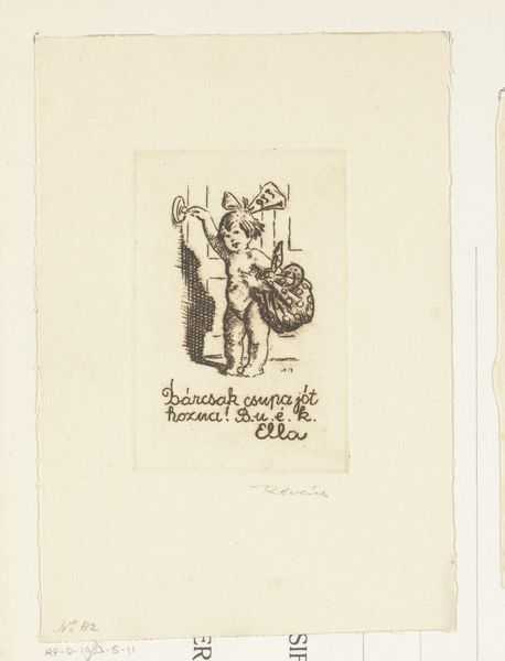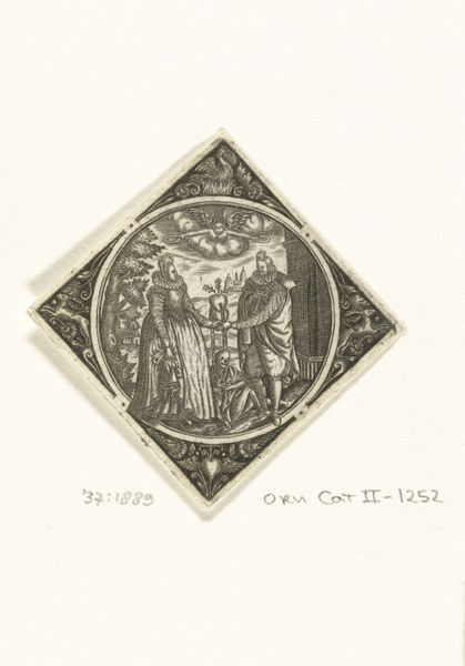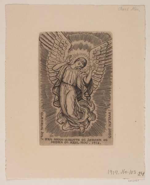 Editor: We're looking at "Grave Monument of Joanna Jakelina Carolus," an etching made between 1824 and 1865. The scene feels so intimate, even mournful, with its depiction of grief. What formal elements stand out to you in this print? Curator: Observe how the artist, Louis Antoine Carolus, orchestrates line and light. The linear hatching defines the figures and creates tonal variation, setting an elegiac tone. Editor: I noticed the angel and the grieving figure are distinct in posture and line weight. Why do you think the artist chose to show it that way? Curator: Indeed, this contrast heightens the emotional resonance of the scene. Consider how the sharp lines on the gravestone anchor the image, while the radiant light above emphasizes a sense of the spiritual, contrasting the corporeal and incorporeal, which is fundamental to allegorical art. Can you sense this tension? Editor: I do, and how the figure on the right reflects that contrast. There’s something so fragile in how the artist captured their figure. Curator: Exactly. Formally, the composition balances the weight of grief with an ascending spiritual promise. Do you see how the inscription reinforces this dynamic through visual symbolism and its linear elements? Editor: Absolutely, the arrangement contributes significantly to the artwork's themes. I hadn't considered that before. Thanks for that insight. Curator: Paying attention to these formal relationships lets us consider more closely how the artwork communicates on different registers of meaning and expression.