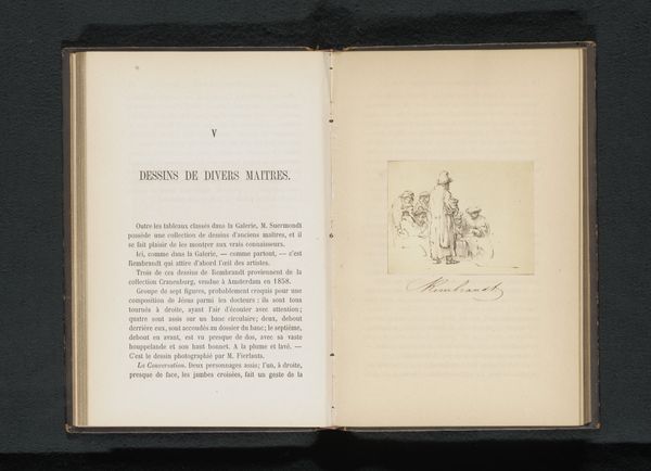 Curator: This is a photogravure after a drawing by Albrecht Dürer. It depicts Dürer in his studio, along with an assistant. The print itself likely dates from before 1860 and reproduces an earlier Northern Renaissance drawing in ink on paper. Editor: My immediate response is one of fascinated intimacy. The stark lines almost give the sense that we are secretly peeking into a private, creative moment between the master and his apprentice. It really feels human and accessible. Curator: The composition here is actually quite strategic. Notice how Dürer, seemingly captured mid-motion, balances against the more statically posed assistant. The perspective lines of the studio itself converge, subtly drawing our eye towards Dürer's expressive gesture. Editor: Absolutely. I’m struck by how this everyday workshop scene elevates Dürer, already during his lifetime, to a legendary status, almost a symbol of artistic prowess itself. We are shown the origin myth right here: "This is how the Master works!" Curator: In its material qualities as a photogravure, there’s a layering of media too. Photography capturing print which copies drawing... each medium inherently interprets and abstracts the line and tonality, thereby shaping our visual experience of Dürer’s original artistic process. Editor: The visual elements further reinforce themes of mentorship and transmission. This work immortalizes Dürer and establishes a link, maybe unconsciously, between the masters who have come before and those who will continue the chain of genius after them. Curator: Indeed, that tension—between capturing a realistic moment and mythologizing artistic practice— makes this reproduction so compelling. By meticulously deconstructing how Dürer structured space and movement we perceive the original’s artistic intent differently. Editor: It's truly more than just a recording; it’s an artifact of reverence, inviting reflection on art and what it means to preserve genius. It is really great work, offering complex symbolic insights from different vantage points.