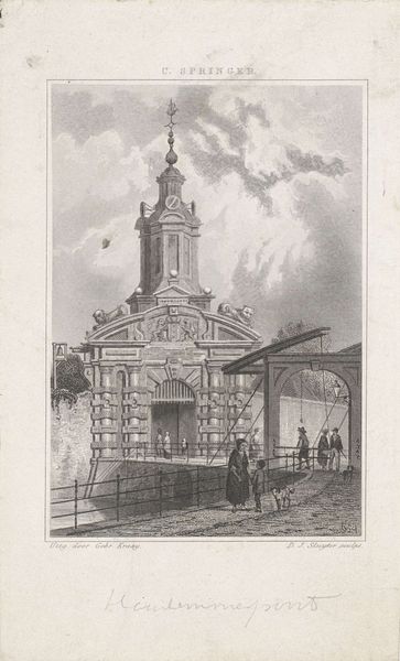 Editor: Here we have Auguste Raffet's "Church and Tower of Three Saints, Yassy, Moldavia, July 19, 1837," created around 1840, employing lithography, etching, pencil, graphite and paper. It strikes me as a very balanced composition despite its apparent spontaneity. What are your initial observations about the work’s formal qualities? Curator: The piece is fascinating for its exploitation of line and form. Note how Raffet uses distinct line weights to create depth; the foreground figures are rendered with darker, more defined lines compared to the more subtle gradations used for the background architecture. What does this layering accomplish? Editor: It feels like the darker lines bring those figures into the viewer's space, making them feel closer, more present. Almost as if the artist is setting the stage. Curator: Precisely! And consider the interplay between the geometric precision of the buildings and the more organic, sketch-like quality of the figures and foliage. Does this contrast create any tension for you, and if so, how does the artist reconcile it? Editor: It does! The figures feel a little scattered compared to the clean lines of the church. Maybe he's trying to soften the rigid lines with the natural and social elements to create visual harmony. Curator: Indeed, that careful orchestration of detail reveals a sophisticated understanding of spatial relationships and compositional balance, which results in this intriguing dynamic. I think what stands out is the geometric nature of architecture with nature with humankind, forming a coherent whole that elevates the lithograph's impact, creating its distinctive charm. Editor: I see! So by studying the linework and composition we can understand the artist's process, what was important for them to highlight, and ultimately have a greater appreciation of the image itself. Curator: Exactly! Formal analysis provides a structure that facilitates observation-driven interpretation of the artwork.