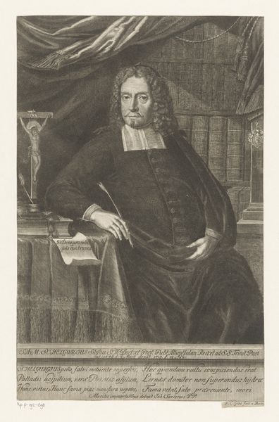 Curator: I find myself immediately drawn to the quiet dignity in this portrait. The subject appears self-assured, yet there is a certain pensiveness in his gaze. What do you see? Editor: The somberness of it is really striking; it's almost a melancholic scene despite the opulence. This work, created by Jan Lievens around 1640-1650, depicts Ephraim Bonus, and what's really interesting to me is its public role as a printed image at that time. Think of the accessibility! Curator: Indeed. Beyond the somber tone, the meticulous rendering of details like the beard, the fabric's texture, or even the slight glint in his eyes contributes so much. It goes beyond mere representation; Lievens uses those symbols to evoke intellectual weight and even a deep cultural heritage. Editor: Absolutely. Its distribution as a print—an engraving—meant it circulated within specific intellectual and perhaps even medical circles, reinforcing Bonus’s standing. How was Lievens, an artist who operated within very specific commercial and patronage networks, attempting to convey authority? The column in the background—what sort of social cue is provided through such a symbolic reference to classical antiquity? Curator: The column speaks to notions of strength and tradition, absolutely. It's part of the visual vocabulary to present Bonus as a figure of lasting importance, maybe tying him to lineages of wisdom extending into antiquity. Also note how light and shadow converge so intensely on his face. It elevates his knowing glance, as if he holds secret insights. Editor: Agreed, and think of the printing process at the time. The choices in tonality and the stark contrasts weren't just aesthetic. They allowed for clarity and readability when reproduced. So, it was very much about efficiently projecting the intended message onto the greatest number of people, bolstering the symbolic impact. Curator: I can almost hear the rustle of the paper, envision this piece being studied amongst scholars... Even now it projects an evocative authority. It underscores the power that images hold. Editor: Yes. Images weren’t simply decorative—they were actively shaping public perceptions and negotiating identities. Examining who and what was considered worthy of depiction in print is crucial. It brings me back to consider that we still grapple with representation and legacy-making in an equally image-saturated environment today.