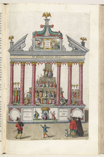 Editor: Here we have Pieter van der Borcht the First's "Milanese triomfpoort, 1599," a drawing realized in colored pencil, ink, and engraving, and printed on paper. The arch is so elaborately decorated that it seems more like a layered cake than a structure. I am interested to hear how you read the overall composition and construction of the drawing. Curator: Indeed. Let's consider first the organization of pictorial space, and the function of line. Note how the artist uses rigorous, almost architectural lines to define each level of the arch. How would you characterize this formal organization? Editor: Structured, maybe even rigid? There's very little flow; instead, there is a pronounced horizontal emphasis. Curator: Precisely. Observe how each layer operates as a discrete pictorial plane. The eye is led not into, but up the composition, level by level. Also, how does the geometry influence the narrative? Consider the figures in the arches… are they also constrained and governed by these principles? Editor: Well, they appear in separate framed vignettes. The composition definitely reinforces that sense of controlled, staged presentation. It's like a series of miniature theaters. What effect do you think is achieved with the limited color palette? Curator: Color, or rather the sparing use of it, acts here less as a descriptive tool, and more as an accentuation of form. Note where the colors *are* used - drawing our attention to key structural points. It functions as highlighting. The print emphasizes the geometry by selectively applying color, in that the structure supersedes individual elements. Have your thoughts about this piece changed as a result of this conversation? Editor: I've come to appreciate how meticulously Van der Borcht uses line and selective color application to underscore the hierarchical organization of this arch. I initially overlooked that in favor of the overall effect! Curator: Likewise, focusing on the structure allowed us to better decode the organization.