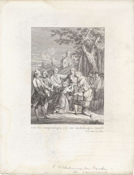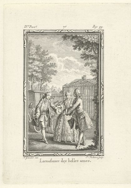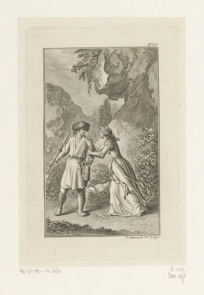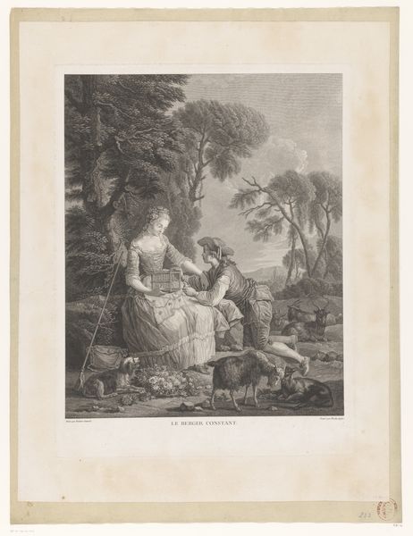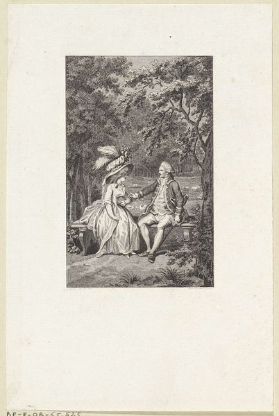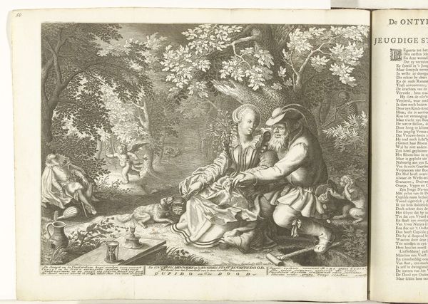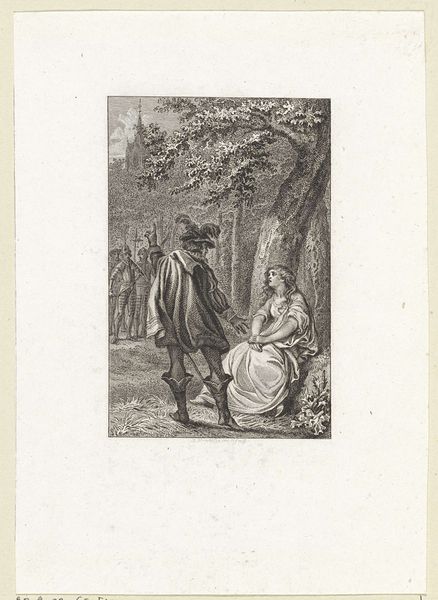 Curator: Looking at this print, "Landscape with Three Music-Making Muses," dated between 1683 and 1733, and attributed to Bernard Picart, I'm immediately struck by how the Baroque style intermingles with idealized nature. Editor: Yes, it's quite a tableau. What strikes me first is the languid melancholy in the figures, especially the muse engrossed in her book. Even with the instrument present, there's a certain quiet gravity in the scene. Curator: Considering the period it was created, that solemnity might reflect broader social currents. The Muses, historically associated with inspiration, are here portrayed in a moment of calm reflection rather than frenzied creativity. One might speculate about the societal role of art and knowledge being questioned or redefined at the time. Editor: Precisely! It feels as if these classical figures are reinterpreted through a lens of introspective humanism. The visual symbols—the musical instruments, the book, the laurel wreaths—they all contribute to this sense of profound thoughtfulness. Perhaps there is a conscious nod to intellectual tradition? Curator: Most certainly. The print allows for a wide interpretation, and as an engraving meant for wider distribution, the landscape element can easily communicate peace and accessibility to any member of the public at the time. The selection of a simple landscape, absent dramatic, grand architectural constructions is important in my mind. Editor: A fascinating interpretation. Thinking about the symbol of music: the muse with the string instrument seems suspended mid-stroke. Is it music being created, or the memory of music echoing? That ambiguous moment is key. This suggests that even joyous expression is tinged with fleeting beauty. The landscape itself serves to evoke cultural memory. Curator: An interesting way to frame it. Indeed the tension and delicate engraving contributes to an appreciation for art, in times where it could very well disappear if one did not reflect on it. I have considered something new in looking closely today. Editor: Likewise, diving into the layered symbolism of "Landscape with Three Music-Making Muses" has highlighted how Bernard Picart’s image evokes not just art's beauty but the transient nature of inspiration itself.
