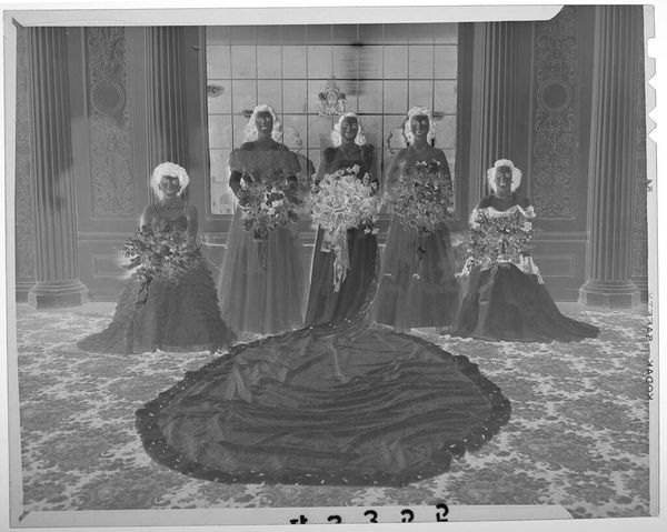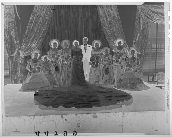Curator: This photograph by Martin Schweig, currently titled "Untitled (portrait of bride wearing crown-like veil with two bridesmaids)," offers a glimpse into a bygone wedding. Editor: It feels like a memory struggling to surface, doesn't it? Ethereal, almost haunted. The inverted tones lend it such an otherworldly quality. Curator: Precisely. The composition itself is meticulously structured, a study in symmetry with the bride as the central axis, flanked by her bridesmaids. Note the interplay between the figures and the backdrop. Editor: Those palms feel so theatrical, staged. Like a dream of a wedding rather than the real thing. I wonder, what's the story behind those inverted colors? Curator: That likely stems from the photographic process itself, a negative image. It invites us to consider the artwork as a representation, a constructed reality rather than a direct reflection. Editor: It's captivating, and a bit melancholic, don’t you think? It makes you wonder about their lives, their stories frozen in this odd, dreamlike moment. Curator: Indeed. It is a poignant visual study, inviting continuous theoretical and emotional engagement.