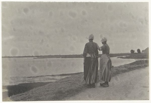 Editor: So, this photograph, "Jagers waden door het water, vermoedelijk aan de kust bij Arcachon," was taken in 1898. The work feels kind of haunting to me; they look so forlorn standing out there. What jumps out at you? Curator: Ah, yes, the somewhat mournful beauty. It makes me think about how much photography has changed, yet, these quiet introspections are timeless, aren't they? Their formality contrasts sharply with their vulnerability, almost comical and unsettling at the same time. I think there is loneliness there, an echo of the solitude perhaps experienced by the subjects within nature’s grand theatre, what do you reckon? Editor: I agree, that almost performative stoicism is pretty powerful here. Did people stage photographs more back then, before everyone had a camera? Curator: I believe they did. A moment captured in glass or on film demanded deliberate contemplation. And in that staging, sometimes profound truth is revealed... the human condition against the backdrop of the sea's immensity. Do you think there's anything significant about the small boat in the distance, the third man that is separate from the other two? Editor: Oh wow! I completely missed that at first, the other man. That adds an element of voyeurism, almost! I'm starting to wonder who took this photo, and what their relationship was to these subjects? Curator: Exactly! The mysteries deepen, don’t they? To contemplate that initial viewer is to enter an ever expanding discussion that spans multiple views and levels of understanding and mystery, a great joy of any artwork. Editor: I will definitely see that third man next time and wonder about his motives! Thanks! Curator: My pleasure. Every viewing is a new dialogue, both with the art and ourselves, it's so profound.