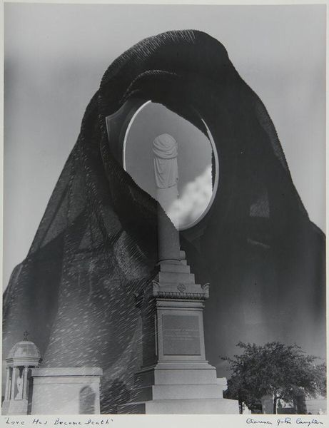 Editor: Jaromír Funke's "Time Persists", created between 1930 and 1933, presents an eerie, almost surreal scene in monochrome photography. It juxtaposes a classical-style angel statue holding what looks like a wreath with what appears to be a tall, industrial chimney in the background. The contrast is so stark. What strikes you when you look at this work? Curator: It's fascinating how Funke uses these materials - a sculpted form captured through photographic means - to disrupt the idea of timelessness typically associated with monuments. The industrial chimney immediately grounds the angel in a specific moment, a particular mode of production. Look at the process: capturing stone with light sensitive emulsion. How does this interplay between the object, method and the means of technological capture affect your understanding? Editor: I hadn’t thought about the chimney representing a mode of production. I guess I was more focused on how the wreath and the angel usually symbolize eternal life, while the industrial chimney hints at modernity, labor and its inherent temporality. So it's a planned subversion using the subject but also the method used. Curator: Exactly. And think about the act of photography itself. It freezes a moment in time, a commodity created through the labor of the photographer and the technology employed. The choice of monochrome further abstracts reality, drawing attention to the materiality of the image, the grain, and the contrast created through chemical processes. Does understanding this industrial process change your perception? Editor: Definitely. It's not just a melancholic image anymore. Now I see the tension between the handmade, unique sculpture and the mechanically reproducible photograph, highlighting different forms of labor. It all brings more layers to the discussion of time. Curator: Precisely. And by juxtaposing these elements, Funke encourages us to question what endures, how things endure and what we value in the face of industrial progress. Editor: Thanks, this breakdown really shifted how I view not only this photo but surrealism and photography from the period in general!