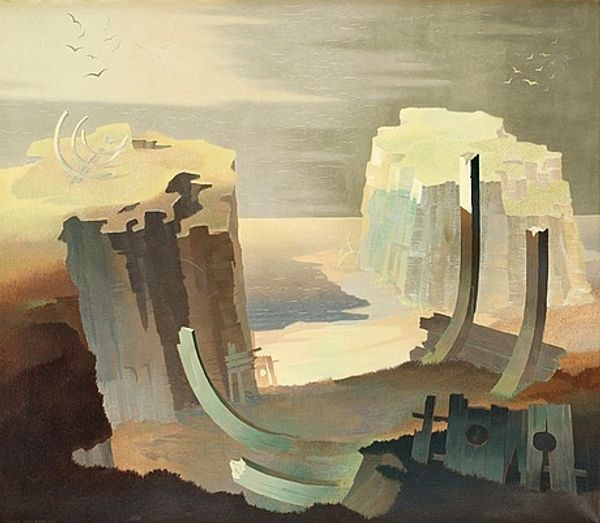 Curator: Looking at this "Untitled" oil painting, possibly by Zdzislaw Beksinski, the first thing that strikes me is how grounded the fantastic feels. The earthy, muted palette anchors what otherwise could be pure whimsy. Editor: Grounded? For me, there is a definite otherworldliness, or perhaps an entry into an alternative reality, with those tower-like forms. The textured surfaces read as if the paint itself is an artifact of some lost civilization. What about the symbolism? Curator: To me, the towers resonate with symbols of human aspiration—reaching for enlightenment or perhaps acting as lonely monuments to the self. I wonder about the gateway at the top. The crescent moon and star-filled night are symbols of intuition and feminine power. The artist gives us a symbol of subconscious dreams within. Editor: Yes! Look closely at the visible layers of paint. I wonder what tools and materials Beksinski was using and experimenting with. Notice, especially, the stark textural differences –the matte tower contrasting against the luminous depth inside its aperture, the feathery rendering of the cloud formations. Curator: I see that interplay too. He has combined solidity with transience in an engaging push and pull. I am interested in the composition itself. What do you think it means to leave it untitled? Is that just another entry into the world of abstraction? Editor: Perhaps it's an invitation, giving us free rein to consider its social meaning or intended value beyond labels or predetermined narratives. Its lack of specificity becomes part of its aura, lending a unique character and a broader social significance by emphasizing material properties of process and form, inviting active viewing and open contemplation. Curator: I like that, and indeed it invites open interpretation while invoking shared memories—a fitting end, I believe, to our investigation into this work’s deeper resonance. Editor: Exactly! The tactile and symbolic interplay makes for more questions and observations about material transformation and interpretation.