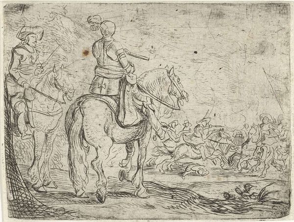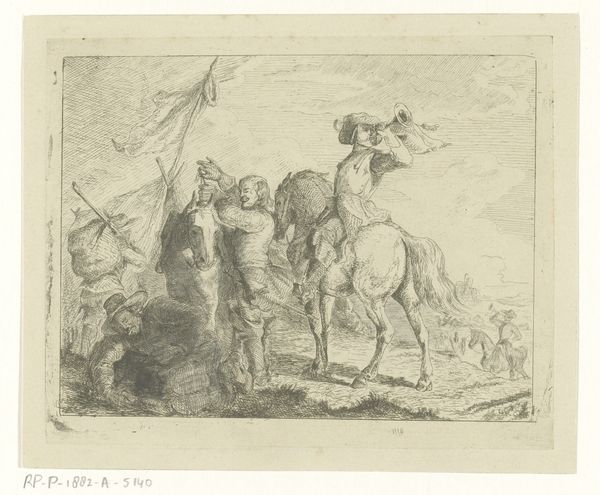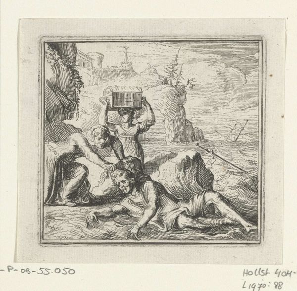 Curator: The first thing that grabs my attention here is this detailed rendering achieved through etching and engraving. It's an illustration from 1697 by Romeyn de Hooghe, part of Boccaccio's Decameron. Look at the precise lines creating depth, almost like a photograph of its time, it is almost mass-produced, given how detailed and accurate this etching of a story of Boccaccio's Decamerone is. Editor: It definitely has that handcrafted feel, even with the precision. What is it about the materiality of printmaking that's key here? Curator: Consider the labor. Engraving demands skill and time. De Hooghe was reproducing stories for a potentially wide audience. Print democratized narratives but required specialized knowledge and tools. The lines themselves aren't just depicting figures, they are evidence of a process, of the artist's hand guiding the burin. Where would such prints be consumed? In private homes, circulated in burgeoning literary circles, impacting moral judgements and values. Think about who had access to it? Editor: So, it’s about the spread of knowledge and the materials used in the service of culture? Curator: Exactly. And the accessibility granted to them. What would have been confined to wealthy circles can reach the merchants of the new age. The very act of printing becomes part of the story. It shifts artmaking from unique artworks to easily copied materials. Do you agree with this view? Editor: Yes, the idea that an artist can create something that anyone could have in their homes is a modern one, yet one of democratisation! Thanks, I never looked at it from that perspective! Curator: Considering art through the lens of materials helps unveil these hidden facets, doesn’t it? I never cease to enjoy printmaking's combination of replicability and the individual talent involved.