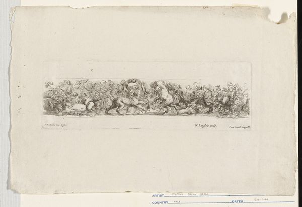 Curator: Up next, we have an engraving by Franz Ertinger titled "Fries met vier saterkinderen en twee luipaarden tussen bladranken", or "Frieze with four satyr children and two leopards amidst leaf tendrils," created sometime before 1678. Editor: What strikes me immediately is the dense, almost chaotic composition. It’s as if the artist is intentionally creating a visual puzzle. The light and shadow create a dynamism that almost feels frenetic, a very baroque exuberance! Curator: Indeed, that sense of exuberance speaks to broader cultural narratives of the era. Satyrs, linked to Dionysus, embodied untamed nature and were often symbolic of sexual license, and hedonism. They occupy a space that’s deliberately subversive. Their presence questions the very rigid social hierarchies and moral expectations prevalent at the time. Editor: Semiotically, these figures perform in such an interesting fashion! Consider how the intertwining foliage not only creates a frame, but it also obscures and reveals. It invites the viewer to engage actively, to search for form within a seemingly formless thicket, constantly negotiating the distinction between the organic and the representational. Curator: Furthermore, these representations of childhood take on extra layers of meaning when considering contemporary socio-political dynamics. Children and childhood were very differently represented. Satyrs in their chldhood reflect specific ideological positions relating to human nature. What we see represented are the views of adulthood through a critical lense on gendered behaviors, which is particularly important. Editor: That interplay reminds me that Ertinger's technical skill needs underscoring. Look at the varied linework—how he suggests volume, texture and depth, all with a limited palette. I keep coming back to the texture in this! The printed image itself seems incredibly alive despite its limitations of line and form. Curator: And in a way, that vitality embodies how this fits in with its Baroque context— an era of intense drama and bold expression when seen through this perspective of social change, questioning long-held gender norms, etc. Editor: Well said. The work certainly invites contemplation on several levels. Curator: Absolutely; its lasting relevance makes for a challenging re-contextualization for viewers today.