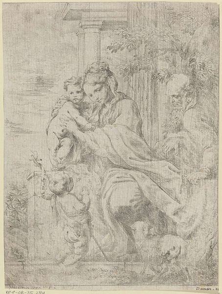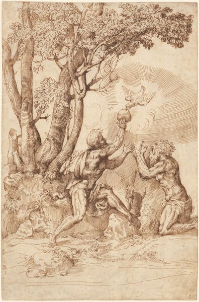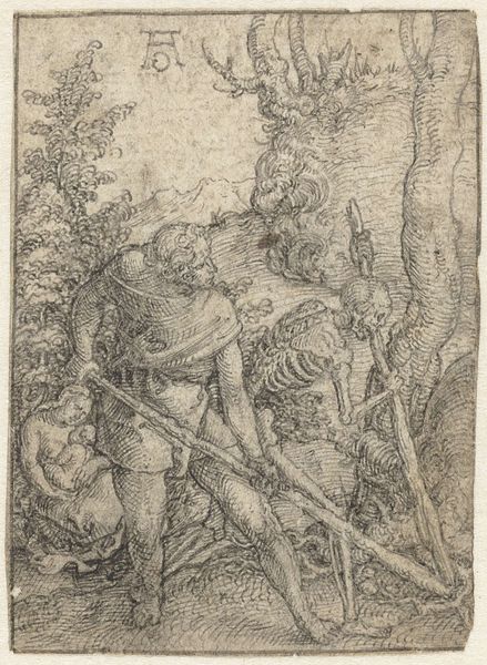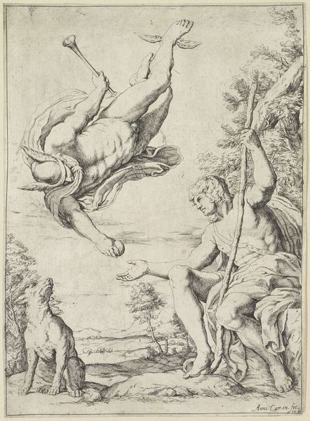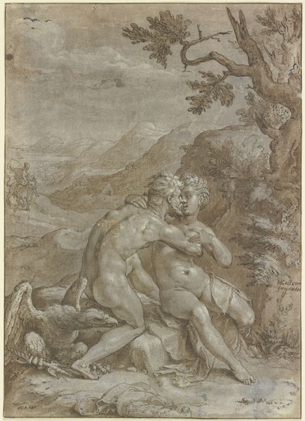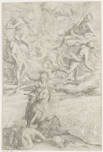 Curator: Welcome. Here at the Rijksmuseum, we’re standing before Battista Franco’s engraving, "The Rape of Deianira," created sometime between 1520 and 1561. Editor: My first impression is a sense of frantic energy. The line work, though delicate, creates a real feeling of movement. Look at the centaur, his posture, the way he is positioned, seemingly bursting out from the landscape, contrasted to the detailed etching of the landscape elements which surround it. Curator: Absolutely. Considering Franco's printmaking technique, the engraving medium would have demanded skilled labor and specific tools. The act of incising lines into the metal plate and then using that plate to reproduce this scene speaks to the wider accessibility of images during the Renaissance. Think of the print not just as art, but as a reproducible commodity. Editor: And the myth itself—the rape of Deianira by the centaur Nessus—carries immense symbolic weight. It is a primal scene about unchecked male desire, violation, and the vulnerability of women. It's disturbing to think how readily this narrative, and its underlying ideology of domination, circulated. Curator: Precisely. The reproductive nature of printmaking allowed for wider dissemination of those ideologies. Notice the centaur’s muscular physique and Deianira’s contrapposto pose. It calls attention to their power dynamics, yes, but how might this print, through its composition, invite viewers to, if not condemn then consider their position in this encounter. It almost asks, what action do we take? Editor: True. And this imagery certainly links back to older visual traditions, particularly classical sculpture and vase painting. Franco positions the players, figures from antiquity in poses that nod to classical antiquity, re-performing older cultural narratives to which people reading his prints would have an indexical association. I also consider its implications in gendered and patriarchal structures as it may function for a modern viewer, it becomes fraught with symbolism surrounding victimhood and toxic masculinity. Curator: Interesting thought, how that shift would have occurred, due to, of course, modern interpretations, not possible during its conception. In conclusion, by analyzing Franco’s work through material production and its relation to a long visual history, we can unlock critical social commentary on this era. Editor: It definitely leaves a lingering unease and many complex layers of understanding regarding historical narratives surrounding vulnerability and power dynamics.