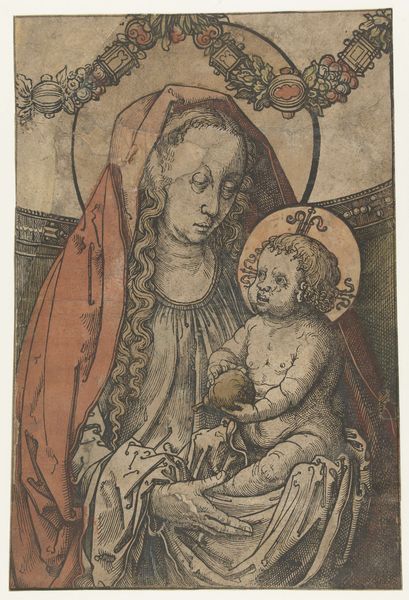 Lucas van Leyden made this engraving, Maria met kind, in the Netherlands sometime in the early 16th century. During this period, artists like van Leyden were navigating a complex social and religious landscape marked by the rise of the Protestant Reformation. Images of the Virgin and Child were central to Catholic devotion, embodying ideals of motherhood, purity, and divine love. But they also became sites of contestation as reformers questioned the role of religious imagery. Here, Mary's serene expression and tender gaze towards her son evoke a sense of intimate connection, while the halos symbolize their sacred status. Consider how such images functioned not just as representations of religious figures, but also as affirmations of faith, and cultural identity, in a rapidly changing world. The emotional resonance of this work lies in its ability to bridge the earthly and the divine, offering viewers a glimpse into the maternal bond. It reflects a society grappling with questions of faith, identity, and the role of women.