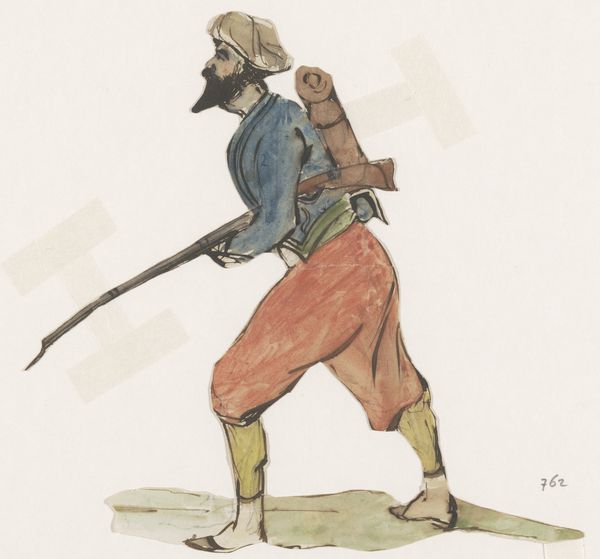 Curator: Here we have Edwin Austin Abbey's "Study for a figure in ‘Valley Forge’ mural at the state capitol building in Harrisburg, Pennsylvania." Editor: It's strikingly stark, isn't it? The grey background makes the figure, with his musket, look almost spectral, a ghost of revolution. Curator: Precisely. Abbey was deeply engaged with American historical narratives. This study reveals his meticulous preparation for a monumental mural meant to inspire civic pride. Editor: And it’s so evident in the textures he achieves with charcoal and pastel – the roughness of the clothing, the sheen of the musket. You can almost feel the cold of Valley Forge. There's a real focus on craft here, on how these specific materials communicate a sense of authenticity and hardship. Curator: The choice of pose is deliberate, too. Kneeling but alert, he embodies resilience amidst suffering, mirroring Washington's leadership in those dire circumstances. Abbey understood the power of symbolism. Editor: But how much does the romanticized view of history overshadow the material realities of the common soldier? This feels idealized. The gun looks heavy but expertly handled. The red scarf at his neck is neat. Curator: You raise an important point. Abbey's murals aimed to uplift and unite, and these preliminary sketches tend to focus on idealized individuals within a larger, glorious whole. Consider it within the context of the Progressive Era's embrace of grand narratives of national identity. Editor: Still, seeing the raw materiality in his draftsmanship, I get a glimpse of something genuine. The study shows labor and skill in the way he has depicted his subject, so the subject's own work is not ignored, exactly. Curator: I agree; and by examining this "Study" – not the finished mural – we can gain insights into the creative process and the careful construction of historical memory itself. Editor: It makes one think about all that goes into even these seemingly straightforward depictions of history, right down to the tools used to depict them. Curator: Absolutely, understanding the past through both image and the act of making images lets us have more nuanced perspectives of culture and history.