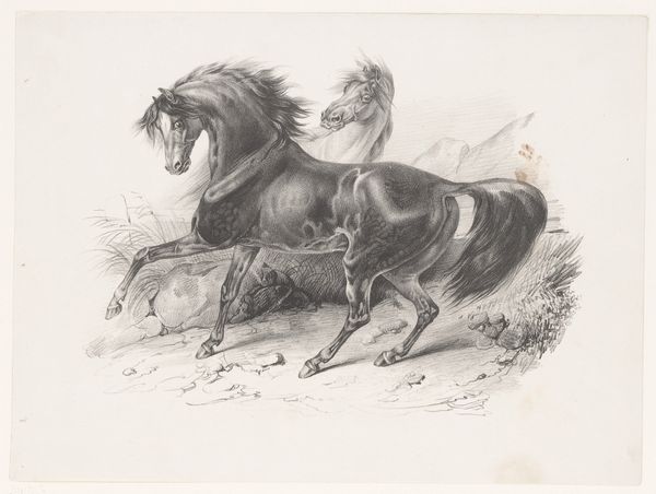 Curator: Here we have a piece titled "Springend paard, in het veld," or "Jumping Horse, in the Field," by Johannes Tavenraat. Created between 1840 and 1880, this drawing employs ink on paper. It resides here with us at the Rijksmuseum. Editor: Wow, that horse! It looks like pure, unbridled joy, caught mid-leap. It’s kind of minimalist but feels super dynamic. Like a moment plucked right out of a dream about freedom. Curator: Indeed, there's a powerful sense of movement, a hallmark of both Romanticism and Realism, movements Tavenraat seemed to navigate fluidly. Drawings like this one were popular during the period to evoke and convey raw emotional states as much as they represented scenes or beings, and we must not forget the influence of artistic patronage during the Biedermeier era. Editor: I love how spare it is. You get just enough of the landscape to ground the horse, but really, it's all about the animal's energy. I imagine the artist just pausing by a window and capturing a moment of daily beauty—or maybe projecting some fantasy. The little smudge by the horse’s nose even looks like pixie dust, so I am thinking there must be some projected fantasies here. Curator: Consider the social implications as well. Horses were essential for transportation and agriculture, which gave rise to equestrian portraiture to signify not just wealth, but social standing. An artist making drawings of animals, divorced from the social utility, reflects changing economic norms. It also allows a focus away from work or production, towards a creature in a state of pleasure or being. Editor: Right. It strips away all the stuffy historical baggage, the power plays and class statements, and just lets you see this beautiful, wild creature existing for itself. As someone who’s worked on environmental activism, this feels like it has the core right; we forget the simple elegance of animals, which here the artist is making sure not to do. Curator: The artwork becomes an articulation of shifting societal values and a microcosm reflecting those changing values of the period. Editor: Well said. Makes me want to trade my shoes for hooves, or at least gallop out into the nearest meadow. Curator: Yes, it’s a fine work in capturing an exhilarating feeling.