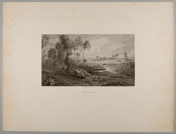 Curator: Alexandre Calame created this lithograph, "Landscape Number 28." The vista feels quite grand, doesn't it? Editor: It does. The stark contrast immediately evokes a feeling of solitude, maybe even a touch of melancholy. Curator: Lithography allowed for broader distribution and a wider audience than painting. Think of it – landscape, once the realm of the wealthy patron, becomes accessible through print. Editor: I'm drawn to the figure nestled by the tree. They seem to be contemplating their relationship to the land, dwarfed by the sublime power of nature. The tree itself could symbolize resilience. Curator: The texture is remarkable, created by layering and manipulating the lithographic stone. It's not just about representing a scene; it’s about the labor involved in bringing nature into the domestic sphere. Editor: A beautiful dance between nature's grandeur and the quiet contemplation of the human spirit. Curator: It's quite compelling when you consider the materials that made mass production possible were being developed right alongside the rise of landscape painting! Editor: Indeed! I am left thinking about the enduring appeal of finding ourselves mirrored in the landscapes we inhabit.