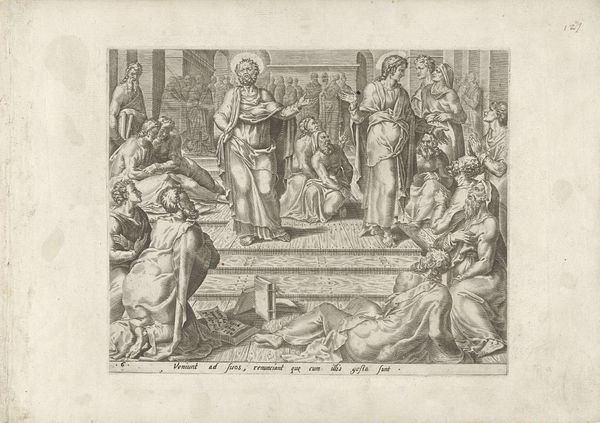This print, titled 'Marta leidt Maria Magdalena naar prekende Christus,' was made by an anonymous artist through the process of engraving. Engraving, a form of intaglio printing, involves meticulously cutting lines into a metal plate, typically copper, using a tool called a burin. The incised lines hold ink, and when pressed onto paper, create a detailed image. Look closely, and you can see how the varying depths and densities of the lines create shading and volume, bringing the scene to life. Engraving was a skilled, labor-intensive practice. The engraver needed to have mastery over the burin, and have a deep understanding of tonal values. While this print's artist is unknown, its existence speaks to the broader social context of printmaking, where skilled artisans played a vital role in disseminating images and ideas, contributing to the visual culture of their time. Remember, considering the materials, the making, and the context, allows us to appreciate the full meaning of such an artwork, blurring the lines between fine art and craft.