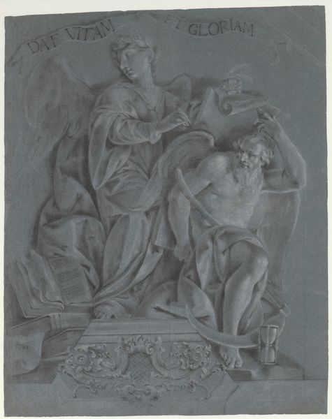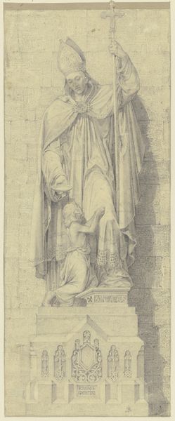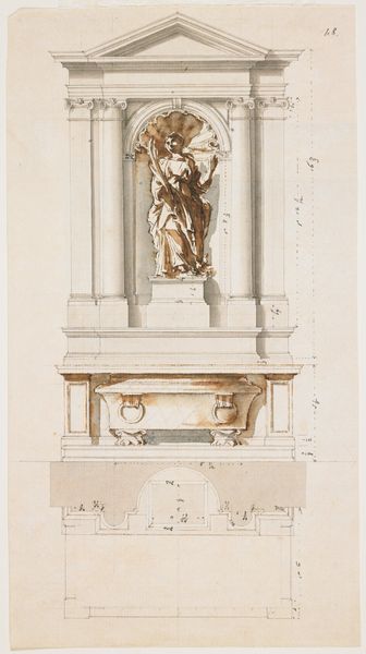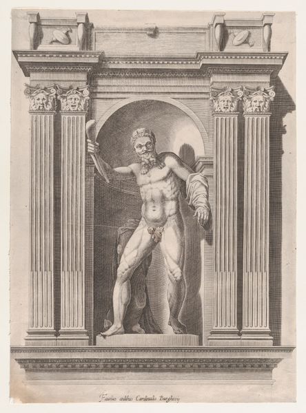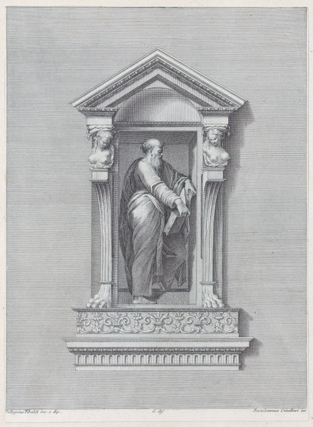 Editor: We’re looking at Bartolomeo Crivellari's "A standing man in a niche reaching forward with one arm," created in 1756. It's a print, an engraving. The figure seems both imposing and fragile somehow, trapped within that architectural framework. What strikes you about its composition? Curator: The piece, ostensibly a representational image, truly distinguishes itself in the geometric interplay of its forms. The figure itself, while classically rendered, exists primarily as a series of carefully constructed lines, each delineating shape and shadow. Editor: Lines as shape... Curator: Observe the niche. Note the relationship between its rectilinear structure and the organic curve of the figure's body and beard. How do those contrasts influence our reading of the image? The Doric order of engaged columns at either side: consider what effect it may have on our interpretation. The entire composition is based on principles of balance and restraint, consistent with interpretations of classical ideals that dominated that period of the 18th Century. Editor: I guess it feels so deliberate and formal, even the shading looks carefully placed. Curator: Precisely. Every line, every area of tone, has been meticulously calculated to produce a sense of harmony and order. It's less about conveying raw emotion, more about a rational presentation. The niche constrains the figure within strict confines and planes. Consider also the overall flatness, and how that contributes to its overall effect. What do you make of the figure's gesture? Editor: His outstretched arm is a break in that stillness, reaching out. That makes it feel more like a drawing of sculpture. The use of engraving does create a sense of depth using only marks. Curator: You're right to emphasize the tactile illusion. It prompts reflection on the function of mark-making. The work invites sustained observation of its formal organization and method, independent of representational concern. Editor: This approach really opened my eyes to details I initially missed and appreciate now. Curator: And for me as well. The close look with a different perspective adds a valuable lens to see its artistry anew.