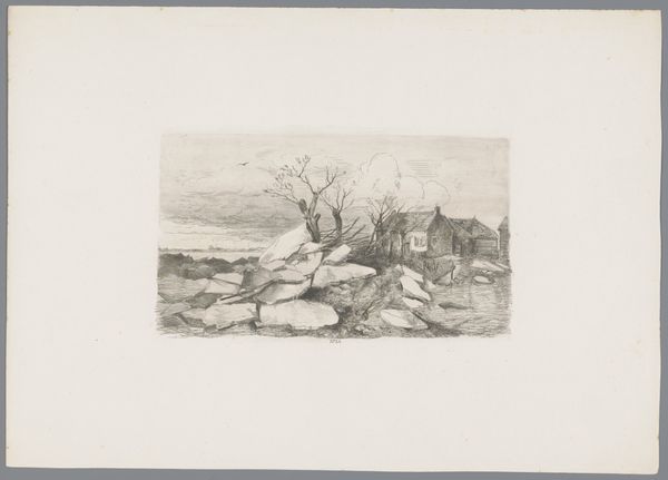 Editor: This is "Gezicht op Dreumel, 1855" by Edouard Taurel, a landscape drawing rendered in pencil. It has a serene and almost melancholic quality, with the figures in the boat looking rather small in the overall composition. How do you interpret this work, especially considering its historical context? Curator: That melancholic feel you describe is interesting, and, I think, very insightful. It’s important to recognize this piece emerged during a period of significant socio-economic upheaval. How might industrialization and urbanization have impacted rural communities, and how might Taurel be responding to that? Consider, for example, the romanticizing of rural labor in contrast to its harsh realities, particularly how access to clean resources might be an unspoken commodity? Editor: That's a good point. The figures do seem to be toiling away, yet the image is picturesque and removed from the hardship implied in rural labor. I never really considered this until now, I have so much to learn! I suppose, does the style "Realism" actually make something "real," and whose reality are we talking about? Curator: Exactly! Realism is never a neutral lens; it’s always a choice, a perspective. Taurel’s reality is shaped by the rising merchant class. Look closer—the deliberate focus on the small details of everyday life speaks volumes, even in a seemingly 'simple' landscape like this. Editor: This is a very thought-provoking new view on the piece. I see this drawing more as social commentary now. Thanks. Curator: Precisely. These images don't just passively reflect the world. They also actively participate in shaping how we understand it. And the artistic choices made give some insight to the political intentions of an artwork. I too appreciate your contribution; you caused me to reflect on my approach to discussing artwork such as Taurel's.