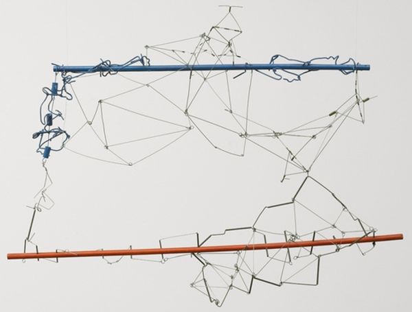 Editor: This is "Greenhouse Glut (Neapolitan)," a 1987 assemblage by Robert Rauschenberg. Looking at this jumble of chair parts and metal frames, I'm initially struck by its fragility, or maybe its transient nature, as though it's been tossed together for a temporary purpose. What are your initial thoughts? Curator: Fragility and transience, excellent observations! To me, Rauschenberg’s "combines" like this one are poems written in the language of discarded things. Think about what each of these objects *was*: a chair meant for rest, bed frames promising sleep. Now they’re defunct, upcycled into something new. It's a bit like life, isn’t it? Things break down, we repurpose ourselves. I wonder, does that Neapolitan title offer another layer for you? Editor: It does, now that you mention it! It reminds me of that layered ice cream... maybe it's Rauschenberg’s visual pun – a delicious treat constructed from the refuse of consumer culture? Curator: Exactly! And that consumer culture is both seductive and wasteful. These found objects hint at the endless cycle of production and obsolescence. And tell me, what does the open structure say to you, or suggest? Editor: I see right through it… maybe its honesty in the sense that it is revealing the ugly materials in order to get the beauty across? Curator: The beauty in decay, in transformation… I find that notion compelling. We assign value to the pristine, but what about the poetry in what’s been used, broken, and reborn? Editor: I hadn't considered it that way, but I love how Rauschenberg forces us to find beauty in the discarded and rethink our relationship with consumerism. I guess there's nothing truly useless, is there? Curator: Precisely! He saw potential in the cast-offs, inviting us to do the same. It makes me question, you know, what "waste" really *means.* And where is the real value of objects beyond utility.