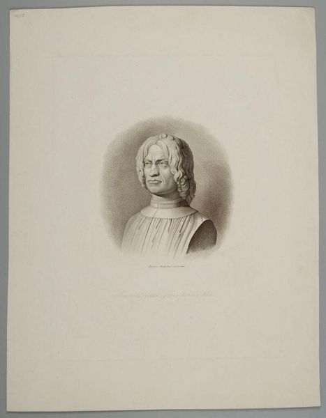 Curator: This is Luigi Calamatta’s "Masaccio." Editor: It's a rather somber portrait, isn't it? Quite minimal. Curator: Calamatta, working in the 19th century, engaged with earlier Renaissance masters. It is interesting to see him choosing Masaccio as his subject. The paper itself communicates something of an academic exercise. Editor: Agreed. The choice of a drawing rather than a painting points toward a focus on line and form, skills vital to the broader project of artistic production and academic study. Curator: Indeed. And how these types of drawings circulated and were consumed also played a role in the public understanding of art. Editor: Right, it shifts our perspective from singular genius to the network of artistic labor.