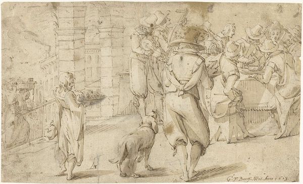 Editor: We're looking at "The Lupercalian Festival in Rome. Cupid and Personifications of Fertility Encounter the Luperci Dressed as Dogs" by Adam Elsheimer, executed in ink on paper. It's a pretty dynamic scene. I'm immediately drawn to the contrast between the frenzied figures on the right and the more composed group on the left. What are your thoughts? Curator: The immediate impact stems from Elsheimer's skilled manipulation of line. Note how the energetic, almost chaotic, lines describing the Luperci contrast sharply with the more deliberate, flowing lines used to depict the figures of fertility. Observe the use of hatching and cross-hatching: denser in the shadowed areas, giving weight and volume. And where does your eye go first? Editor: I think I noticed the contrast, and then the diagonals of the figures pull my attention around the page, particularly following the torch up to the building in the background. Does that direction matter? Curator: Indeed. Consider how Elsheimer employs these diagonals to create a sense of spatial depth, leading the eye from the foreground figures to the architectural backdrop. Also consider, is the structure actually a portal to someplace different? It divides the drawing into halves that explore different states of activity. Does that contrast also underscore some kind of union? Editor: I suppose, a dynamic movement colliding with... stately fertility? Curator: Precisely. Note also the placement of Cupid, bridging these two realms, and how that relates to a reading of unity. It's a fascinating study in contrasts and visual rhythm. Ultimately it is the line work in relation with its subjects that captures meaning, isn't it? Editor: I can see that now; thanks for walking me through Elsheimer’s technical choices! It makes the image so much more alive. Curator: Agreed. By examining the formal elements, we gain a deeper appreciation for the artist's intent and the artwork's overall effect.