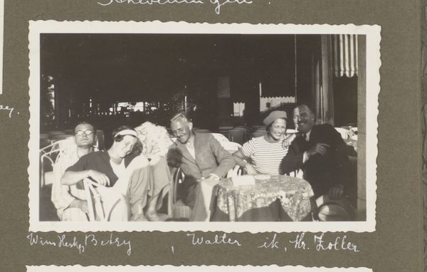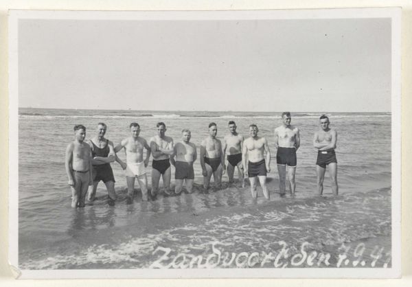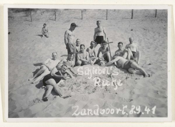 Curator: This photograph, taken sometime between 1932 and 1938, captures a group of people with children on the beach at Scheveningen. The black and white gelatin-silver print seems unassuming at first glance. Editor: I see something almost frozen in time. A little awkwardness hangs in the air, like a still from a film where the director yelled, "Hold it!". Are those bathing suits or something else? And those little huts... Curator: They're bathing suits, appropriate to the time. This is likely a staged "snapshot." It's so clearly posed and the figures so self-conscious, and these beach huts offer clues of a time where going to the beach was somewhat more organised than simply turning up with a towel. The beach as theatre! Editor: Yes! The huts are definitely repeating symbols. There’s something vaguely authoritarian about their regimented order. They remind me of shelters but with that rigid numbered quality. Makes one think about identity and control somehow. Do the people also wear particular swimwear because they feel pressured into doing so? It seems like everybody is wearing swimwear that looks identical. The mood is far away from a summer party at the beach. Curator: Well, it's true; the figures are so carefully arranged – but then you look at the children playing on the sand... their absorbed activity lends a candid energy to the overall composure, that kind of undermines the apparent mood and brings the photograph alive for me! Even that carefully placed striped umbrella adds a little visual flourish. What about the cultural memory that might reside within these types of photograph for the future. Editor: Right. Symbolically the children represent carefree joy but is this photo hinting to any deeper narrative? Like, this isn't simply "snapshot" of some bodies arranged on beach in formal wear, but almost some staged act of freedom performed in front of regimented set pieces? That serious gaze in one or two figures and those repeating cabanas? I would really like to think about that symbolism of freedom or an escape to somewhere different. Curator: That's it: the picture is playing on expectations – a photograph of escape at the beach may, on closer examination, become something else that is about control or identity. A real insight. It also makes you realize how photography captures a complex narrative with what appear to be relatively banal elements. Editor: True. And that makes it all the more interesting and thought-provoking. Something seemingly simple but so open to symbolic readings – like looking into a coded message that unlocks secrets and anxieties of those years.
