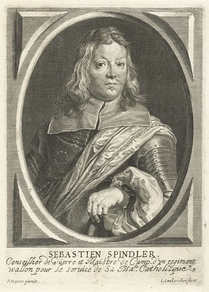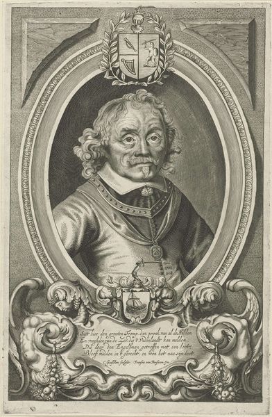 Curator: Before us we have Theodor Matham’s "Portret Johan de Brune" from 1656, held here at the Rijksmuseum. Editor: It strikes me immediately with its almost unsettling realism, achieved solely through meticulously applied lines. The details seem amplified by the monochrome. Curator: Absolutely. As a print, the image has fascinating implications in terms of access and distribution, allowing wider societal access to portraits that were previously limited to the elite. And Matham's choice to depict Johan de Brune, a lawyer and writer, places intellectualism at the forefront. Editor: The rendering is what commands attention. The way the artist employs hatching and cross-hatching to model the face, especially around the eyes and mouth, communicates volumes. Do you notice the almost architectural quality of the surrounding decorative elements? Curator: Yes, the frame mirrors the man himself! De Brune’s career was marked by navigating the complex political and religious landscape of the Dutch Golden Age. His writings reflect his own journey toward religious tolerance, influencing contemporary debates. Editor: So the portrait is, in effect, presenting his intellectual persona. Still, it is Matham's handling of the line, creating varying densities and textures, which holds the composition. See how the formal severity and intensity create almost palpable presence? Curator: He also worked during a period of immense social and economic upheaval, and his life experiences are woven into this very artwork through the intricate symbolism of attire and accessories! Consider, the lace collar signifies status while simultaneously hinting at the constraints placed on the individual. Editor: So much from such precise lines! This really illuminates how much expressive power is found in the smallest detail of artistic technique and cultural significance. Curator: Indeed, a look into the historical conditions of a very tumultuous time in the Dutch Republic! Editor: Precisely. We can truly understand the complex layering of symbolic weight from an earlier century as a result of this nuanced study.