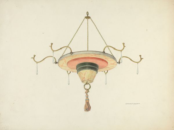 Editor: So, here we have Edward L. Loper's "Weather Vane," created around 1937 using watercolor. It's a seemingly simple rendering, but I'm drawn to the almost technical quality in the presentation, especially that schematic in the corner. What stands out to you about it? Curator: What fascinates me is how Loper, by meticulously documenting this common object, elevates the mundane to art. Consider the weather vane itself—mass-produced, functional, likely made of copper or iron, materials readily available and affordable in that era. Now it's carefully rendered in watercolor, a medium often associated with "fine art" rather than technical illustration. Editor: Interesting! So you see it as challenging the hierarchy of materials and production? Curator: Precisely. Think about the labor involved in creating a weather vane. It involves metalworking, assembly-line processes potentially... whereas the watercolor requires a different kind of skilled labor, of observation and precise rendering. Loper is asking us to consider both. And what about the social context? What kind of building would feature such a weather vane? Editor: Probably a farmhouse, perhaps something that indicated a commitment to industry. Does this make you think about consumerism at all? Curator: Definitely. This depiction almost freezes the object. In doing so, Loper freezes a single moment of early to mid 20th century industry for reflection. Editor: That’s insightful. I initially saw it as a straightforward depiction, but I'm now considering all those different layers you’ve unpacked about the materials, production and even class! Curator: Art, at its best, reveals the intricate web of material culture surrounding us. We need only to slow down to analyze it.