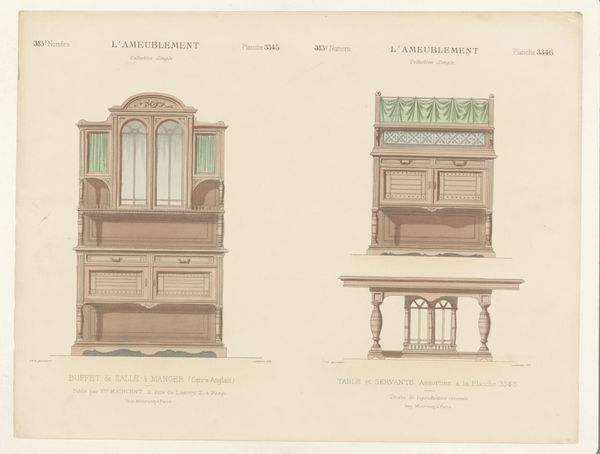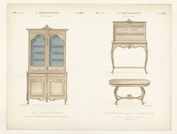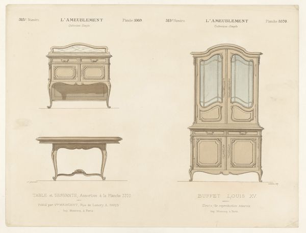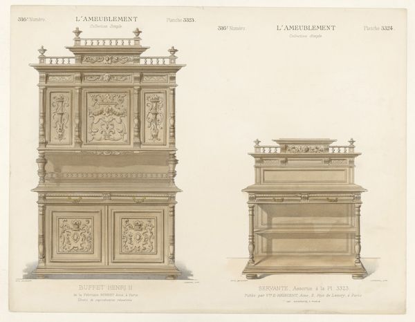 This print by Léon Laroche shows a furniture set in the Renaissance style. It depicts a server and table, along with a dining room buffet. Notice the emphasis on carved ornament, with details that would have required immense skill. Furniture like this was produced in workshops, where divisions of labor prevailed. Certain individuals would specialize in the overall structure of the piece, while others would focus on the sculptural elements. While this division of labor allowed for increased efficiency, it also had social implications: some workers were more highly valued than others. Also, the design references a historical style, in keeping with the revivalist trends that were popular at the time. This design aesthetic was inextricably linked to capitalism, as it signified luxury and status. The production and consumption of such furniture reinforced the class structure of the period. The amount of work involved in the production process underscores the social and economic hierarchies of the time.