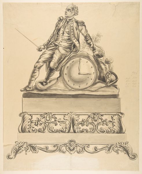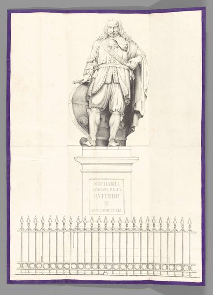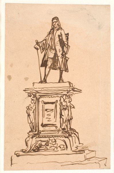 Editor: So this etching by Georg Haas, made sometime between 1781 and 1785, is called *Den Bernstoffske landmand*. It shows what appears to be a statue of a farmer on a pedestal. The level of detail given to the bricks makes me wonder what the context might be. What do you make of this print? Curator: Well, the image itself is a product of material processes – etching and engraving. These techniques, involving labor and skill, transform metal plates into matrices for mass production. The inscription on the pedestal clearly connects it to a specific person. Editor: A person, right. Bernstorff. Who was he? Curator: The figure commemorated—likely Johann Hartwig Ernst von Bernstorff, a statesman who initiated agricultural reforms. What's intriguing is the decision to depict a “landmand” – a common farmer - in a neoclassical style, typically reserved for royalty or the elite. Editor: Interesting. How does the material aspect—being a print—tie into the themes of the work itself? Curator: Think of it this way: Prints democratize imagery. This piece puts a glorified farmer in potentially many hands and homes. It suggests an intent to uplift and popularize agrarian values—maybe even justify the social hierarchy through an idealized, noble portrayal of agricultural labor. What's more, note how the pedestal itself mimics an estate. This creates a connection to tangible labor but elevates a “landmand" into the nobility by using his statue in this estate. Editor: I see. It's not just a portrait, but an object designed to circulate and promote particular social ideas linked to work, production, and the existing social structure. Curator: Precisely. By examining the material means of production, we unveil the artist’s ideological investment. The use of etching and engraving made possible distribution. These images can provide critical insights into 18th century agricultural and class concerns. Editor: I hadn't thought about it that way before, about prints spreading a certain message depending on the medium of material of it all. It gives me a new angle on the subject.