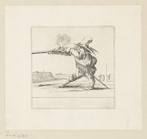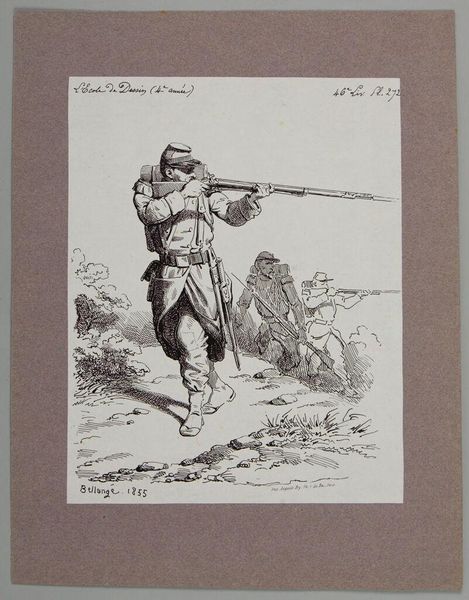 Editor: This pencil drawing, titled "Scherpschutter in actie," or "Sharpshooter in Action," was created in 1855 by Hippolyte Bellangé. It’s currently held at the Rijksmuseum. It seems like a straightforward depiction of soldiers, but I'm wondering about its purpose, given that it’s “just” a drawing. How do you see this work in the context of its time? Curator: It's tempting to see this drawing solely for its representational value, but let’s consider the material circumstances. The "Scherpschutter" offers a window into the industrialization of warfare. Bellange's choice of pencil, a readily available and relatively inexpensive material, suggests a mass-producible image, one that could circulate widely. Were these images perhaps made to popularize and celebrate, and even perhaps, normalize warfare? Editor: So, instead of focusing on the artistic skill, we look at what pencil, as a material, says about the society that created this image? Do you think Bellangé saw the implications of mass producing images of warfare? Curator: Precisely. And let’s look closely at the rifle. Consider the immense resources – material, labor, financial – poured into their production during the mid-19th century. Bellangé, knowingly or not, captured a pivotal moment: the melding of art and industry in service of military power. This image subtly advertises the fruits of industrial progress and implicitly, a worldview reliant on armed conflict. What social strata could access to this artwork at that time? Editor: Interesting! It pushes us to think beyond the aesthetic and into the economic underpinnings of even seemingly simple artworks. The labor needed for both image and war. I will definitely look at other artworks from this new angle! Curator: Indeed. Examining the material realities of artistic creation opens new avenues for understanding not just the artwork, but the world in which it was produced.