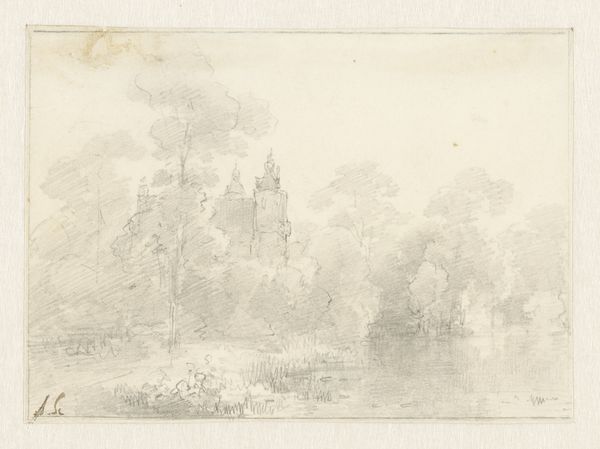 Curator: This landscape, rendered in ink, pencil, and etching techniques, presents Castle Rheban on the River Barrow, Athy, by James Bulwer. What is your immediate take on it? Editor: A dreamy ruin suspended between earth and sky, reflection and reality, stillness and… the whisper of history, I suppose. It’s quite muted; everything seems to dissolve into a soft sepia. Curator: Note how the horizontal composition guides the viewer's eye from the darker foreground towards the light, ethereal structure in the distance. Bulwer skillfully uses linear perspective and atmospheric perspective to create depth. Editor: Absolutely! The reflection acts as a continuation, almost doubling the sorrow. I wonder what life it had… to look like that. It's melancholic, almost pleading, like a forgotten tale yearning to be remembered. Does the River Barrow feature heavily in any local mythology? Curator: Beyond any singular myth, the composition's structure, contrasting solidity with ephemerality, hints at the inevitable decay that all human structures are subject to, while natural elements—the river, the vegetation—persist. Editor: And what do we make of its stark emptiness? Abandonment. Haunting stuff. Almost as if time itself were flowing—both relentlessly and gracefully—away from that lonely place. There are even trees growing within. The return to nature! Curator: Exactly. Observe the layering of textures—the detailed reeds against the smoother water, the rough stonework versus the soft sky. The work prompts meditation on permanence and transformation through a visual rhetoric built upon binary oppositions. Editor: But despite its structural rigour, its emotional undertones refuse to be ignored. One has to feel for that castle! So much of ourselves get locked up inside crumbling architecture of this type. It may very well ask "Where did everybody go?" Curator: Perhaps such a synthesis is the painting's subtle point, as our human desire for lasting constructs fades naturally to blend into, and merge with, organic contexts over vast scales of time. Editor: Well, thank you. I know what I’ll be dreaming of tonight. Maybe it won’t feel so lonely. Curator: A fitting close, I believe.
