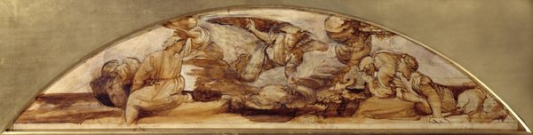 Editor: Nikolaos Gyzis painted "The Archangel, Study for 'The Grounding of Faith'" in 1895 using oil paint. It’s a rather dramatic piece; the dark background and the swirling drapery create a sense of movement. How do you interpret this work focusing on its form and structure? Curator: I find the artist's formal choices quite striking. Consider the limited palette and the broad brushstrokes which almost seem to dematerialize the figure. The contrast between the dark, undefined background and the luminous archangel is structurally compelling. The archangel, with its prominent wings, dominates the pictorial space and leads to a sort of tension within the piece, as we notice its gesture points downwards and is seemingly weighed down by the other figures in the artwork, almost like being forced in a different direction than it wishes to be. How might we decode these stylistic attributes to yield understanding? Editor: The swirling drapery you pointed out definitely adds to the feeling that it is weighed down. So, is it right to analyze that the dynamic lines are meant to show tension between forces within the angel? Curator: Precisely. The composition does not resolve in any classical way; instead, the energy coils inward and remains locked within the frame. Think of how the light catches certain aspects and forms— the wing, the angel’s garments and how the weight and light operate throughout. Consider how the brushwork contributes to this effect as well. Editor: I see now, it really focuses more on how it conveys a certain feeling, which, because of those tensions you noticed, doesn’t exactly end up hopeful! Curator: Indeed! These dynamic brushstrokes and strategic points of interest create visual complexity. Editor: Thank you. I now understand it by seeing it instead of understanding it. Curator: You're most welcome. It has been a pleasure viewing art in this manner.