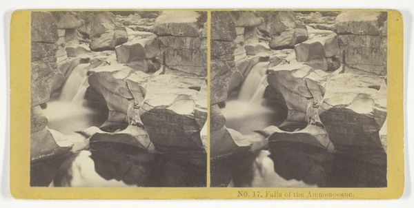 Editor: This is "Fall Creek, Ithaca. Cascades above Irish Hammer Fall" by J.C. Burritt, a silver print daguerreotype from the 1860s. There's something incredibly serene and almost otherworldly about this image of the cascading waterfall. What’s your interpretation of it? Curator: This image, made for a stereoscope, speaks volumes about the changing relationship between Americans and their environment in the mid-19th century. The Hudson River School was hugely influential and helped people see wild spaces in an appealing light, creating tourism and a real push for parks. How does that affect the popular perception of our interaction with nature at the time? Editor: So, it's almost a promotional tool for experiencing nature firsthand and, ultimately, owning that experience somehow. It is in stereo after all - supposed to put you right there! Curator: Exactly. This photograph participates in a broader visual culture that romanticized the wilderness, and made accessible by modern technology like the railroad and camera. The image could become a commodity, travel a display of wealth, an adventure brought home. We see it now, mounted for a stereoscope; this was not a document of experience but part of that experience's visual vocabulary. Does this change your view of that sense of serenity that you mentioned before? Editor: It definitely adds a layer of complexity. It is no longer such an innocent image. Learning the historical context changes how I interpret the tranquility, because it reflects societal motivations that go far beyond a simple appreciation of natural beauty. Curator: Right. Understanding that historical positioning highlights how art can both reflect and influence societal values concerning nature and the pursuit of leisure. Editor: Thanks! Now I see it's a bit of a commercial enterprise disguised as art! Curator: My pleasure; it seems that understanding has broadened your perspective of photography from the 19th century.
