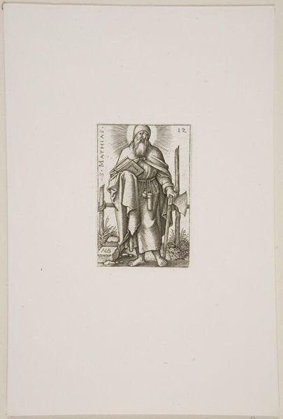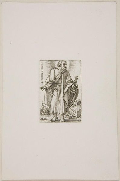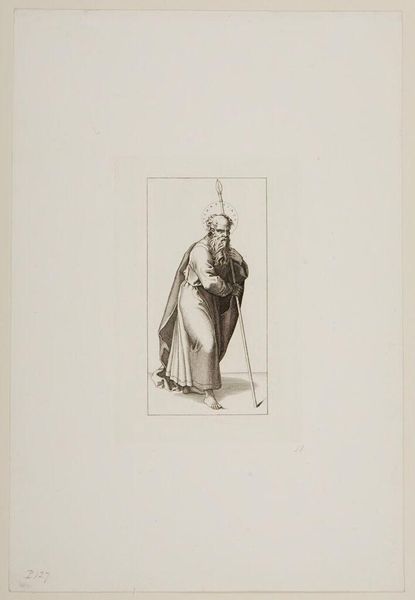 Editor: So, this is Ferdinand Ruscheweyh's "Christ and the Apostles" from the Harvard Art Museums. It's a very formal depiction, but there's something almost serene about the figure. What do you see in this piece? Curator: Serene indeed! It's like a quiet strength emanates from him. I'm drawn to the way Ruscheweyh uses line to create texture, almost like he's weaving a tapestry with his burin. It feels deeply reverent, almost like a whispered prayer. Notice the halo—it's not a solid disc, but a collection of light, sparkling points. Makes you wonder, doesn't it, about the nature of holiness? Editor: It does! It's interesting how something so carefully rendered can still feel so ethereal. Thanks! Curator: My pleasure. Art's always more fun when shared, isn't it?