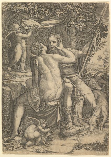 Curator: Looking at this engraving, attributed to Jan van Somer from around 1655 to 1700, entitled "Venus Restraining Adonis from the Hunt," I’m immediately struck by its tonal contrasts. Editor: I find the landscape and the figures rather melancholic, a stillness pervades the scene. Is it simply the black and white of the engraving, or is something else creating that mood? Curator: Perhaps it’s the thematic resonance. We see Venus, the goddess of love, physically holding back Adonis, an avid hunter, from his pursuit. He’s armed with a spear and ready to go, but she’s clinging to him. The erotic playfulness of Venus and Adonis—and the story itself—suggests the risks inherent in love, doesn’t it? Editor: Yes, especially considering what’s to come for Adonis—his tragic death during a hunt. There’s a subtle power dynamic at play too. Venus attempts to disrupt what was historically an almost exclusively male-dominated sphere. It also illustrates, in a broader sense, the struggle for dominance in a world in which roles were dictated by a strong patriarchal order. Curator: That struggle is symbolized by the dog at Adonis’s feet, obedient yet longing to chase. The angel overhead also mirrors this feeling—a commentary on both heavenly and earthly desires perhaps? Even the landscape carries meaning, that distant temple might be another echo of their fate or higher power looking over them. Editor: It raises questions about the agency these figures actually possess. Can they truly alter their destinies, or are they simply enacting a preordained narrative, frozen in a momentary but fatal decision? The engraving acts as an important symbolic marker, a social commentary that still prompts conversations about power and gender relations. Curator: Thinking about how Van Somer worked with lines and light, and how it carries an undercurrent of yearning—both visually and thematically, brings the artwork to life even centuries later. Editor: Indeed. The piece allows for introspection and connects us not only with classical myths but also with persistent challenges regarding fate, freedom, and the consequences of defying deeply ingrained social norms.