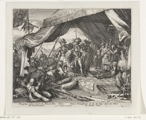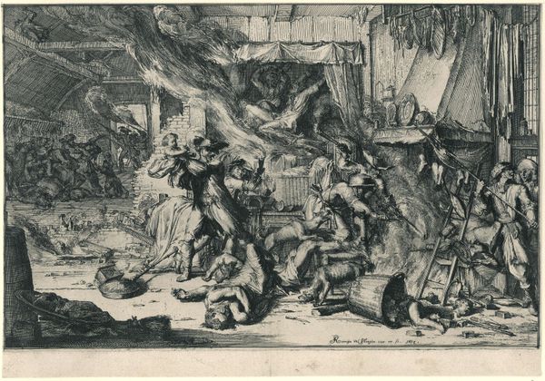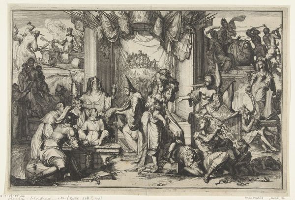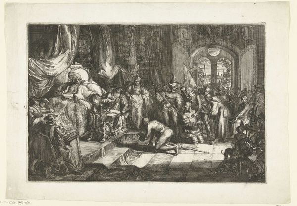 Rembrandt van Rijn created this print, ‘Christ driving the money changers from the temple,’ using etching techniques. The image is a flurry of intricately inscribed lines. Rembrandt scratched away at a metal plate to create this chaotic scene, using an acid bath to deepen the recesses that would hold the ink. The material limitations of the medium - the need to work in reverse, the monochrome palette - are transcended by the dynamism of the composition. Notice how the scene’s agitation is heightened by the contrast between the dark, densely worked areas and the expanses of untouched paper, conjuring the light that pierces through the temple. The amount of labor is evident in the image's detail, yet Rembrandt leaves traces of the immediacy of his marks. This print isn’t just a reproduction; it’s a testament to the physical act of creation. It shows us how the value of art lies not only in its subject but also in the labor and skill embedded in its making.