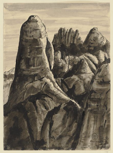 Curator: So, let's spend a moment with Hermann Lismann's depiction of "Der Roque Nublo auf Gran Canaria". The artwork, held here at the Städel Museum, is a drawing utilizing ink and pencil on paper. Editor: My first thought? Stark. It's this landscape, but filtered through such a limited palette. The contrast between the near-black ink and the paper is really hitting me. It feels raw, almost like an etching, even though it's ink and pencil. Curator: It does evoke that sort of direct, almost visceral reaction, doesn't it? When you look at Lismann's process, it's evident in the furious, almost frantic lines, creating both form and shadow with simple, economic gesture. Think about the labor involved—each stroke is a deliberate act, contributing to the overall scene. No paint layering here to finesse and rework. Editor: Absolutely. And you really get a sense of the materiality. You can almost feel the roughness of the paper, see the way the ink bleeds into it. It feels honest in a way that slicker mediums often don't. There's this dance of light and shadow created by this material conversation between ink, pencil, and paper. Curator: Exactly, there’s this wonderful energy to it—it’s not merely representational. He captures a place, but more importantly, he evokes a feeling, right? The Roque Nublo becomes less about a geographical landmark and more about this towering, almost spiritual presence in the landscape. Editor: Definitely. It feels symbolic, almost primal. And I wonder, how much did the limitations—or the affordances—of the materials guide him? He builds texture and depth through hatching and cross-hatching. His choices of line weights really describe those forms of the rocks so we can sense their weight and volume, despite their two-dimensionality. It's fascinating how much information is conveyed with so little. Curator: It leaves us with much to consider, doesn't it? A reminder that profound expression can emerge from the most basic means. Editor: Yeah. Looking at this, you realize the true artistry is not about flashy colors, it is about the simple ways you can let the materials talk back to you, to speak their truths as you manipulate them.