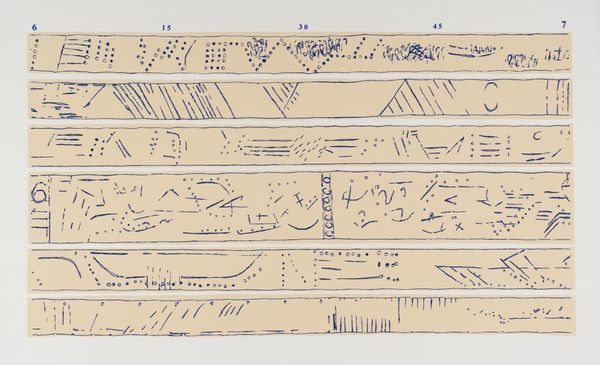 Editor: This untitled piece by Felix Rozen presents rows of what appear to be coded markings. It reminds me of an index or maybe a system of measurement. What do you see in this work? Curator: I see an exploration of the means of inscription. Rozen uses minimal materials – paper and ink, it seems – to create a complex system. It challenges the traditional idea of 'high art' by focusing on process. How might this relate to systems of labor or production, would you say? Editor: Perhaps it represents a form of documentation, like a ledger of labor? It definitely makes me think about the unseen processes behind finished products. Curator: Exactly. By drawing attention to the act of mark-making itself, Rozen compels us to consider the materiality and social context of even the simplest gestures. It changes my perspective on the hidden work behind everything.