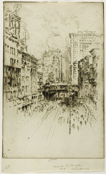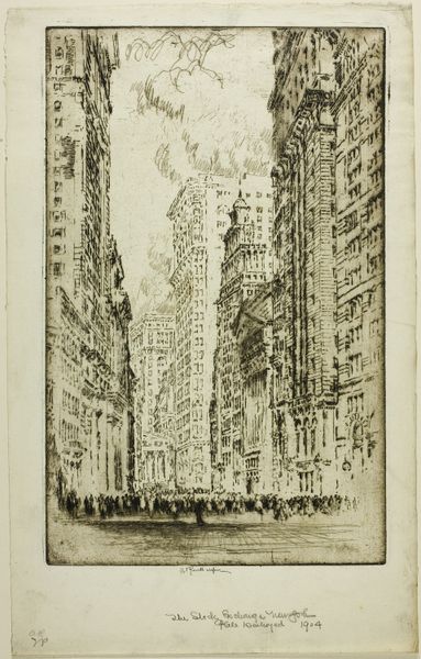 Joseph Pennell made this etching of Lower Broadway sometime during his career, using ink and a metal plate. Pennell’s marks are so evocative, aren’t they? They remind me of the energy of making. You can see the lines of the buildings and the crowd of people below. It's like he’s captured the city's heartbeat! Look how the lines vary in thickness and pressure. Pennell isn't just drawing; he's carving, almost dancing, with his tool. The texture feels raw, like you could reach out and feel the grit of the city streets. The buildings loom above, yet the scene is light, airy, almost dreamlike. There's a sense of movement, the hustle and bustle of city life. Thinking about other artists who have captured cities, I'm reminded of the Ashcan School. They, too, found beauty in the everyday. But Pennell’s lines are more delicate. He’s not just documenting; he's interpreting, giving us a sense of the city as a place of endless possibility.