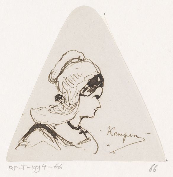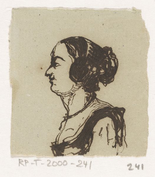 This is a delicate ink drawing of a young girl in profile by Johannes Tavenraat, created around 1845. Tavenraat was working during a period of significant social change, as traditional class structures were increasingly questioned. The girl's simple headscarf and modest attire speak to the socio-economic realities of many young women during this era, where options for self-expression and social mobility were limited by gender and class. The profile view, a classical artistic convention, places the girl within a historical lineage of portraiture, yet her simple clothing suggests a departure from the opulent displays of wealth often seen in such portraits. What does it mean to apply such an elevated style to such an ordinary subject? The drawing invites us to consider the individual dignity and worth of a young woman whose name we may never know, but whose quiet presence lingers on through Tavenraat's sensitive rendering.