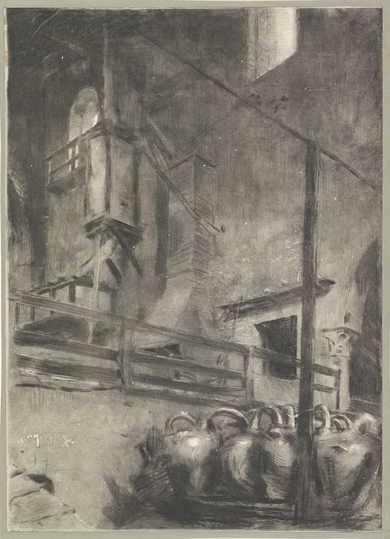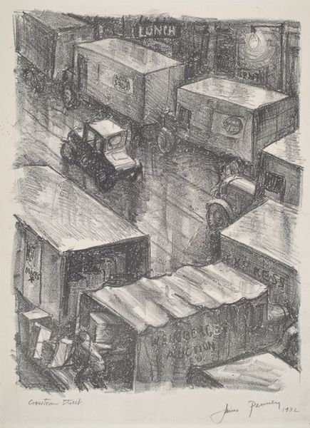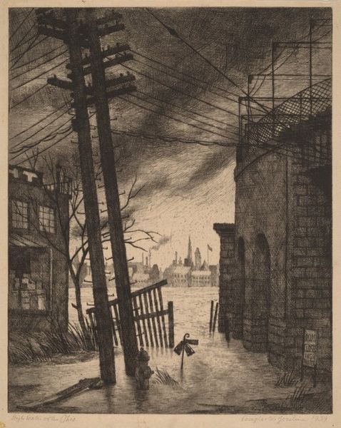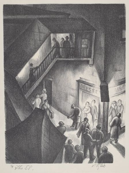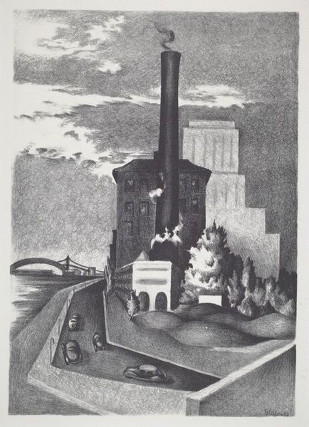 Editor: Herschel Levit's 1938 print, "Textile Mills Kensington," captures a stark cityscape. The smoke billowing from the mills creates a somber mood, despite the children playing in the street. It is rendered mostly in grayscale, and is heavily contrasted. How do you read the symbolism of industry against the daily lives of people here? Curator: The juxtaposition is precisely where the symbolic weight lies. Smoke stacks weren't simply part of the landscape; they symbolized progress, employment, and economic stability. Yet the smoke, even in a rendering such as this, also hints at something darker: pollution, the relentless march of industrialization, and a kind of oppressive weight bearing down on the very community it sustains. Does the seemingly innocent game these children are playing also remind you of an escape? Editor: Absolutely, especially as it's set against the backdrop of those looming factories! But I am left wondering why the composition of children playing with telephone polls overhead feel like conflicting themes within this one scene? Curator: Precisely. Those telephone poles almost become crucifixes with their horizontal cross-sections. The energy of that implied movement is trapped as though crucified. It speaks to a larger, more persistent memory that the generation depicted can only sense from the margins. What do you make of the lone cyclist on the lower portion of the drawing, who contrasts so vividly against these group scenarios? Editor: I feel he may indicate some autonomy of progress amid a static group, given their proximity in relation to one another. It suggests individual opportunity amongst societal stagnation, a fleeting moment in a community so tightly wound up in its traditional infrastructure. Curator: Precisely. See how these familiar shapes, a street corner, telephone pole, a factory can be so laden with the past, influencing, even defining the present? What seemed like a simple cityscape is, in reality, a powerful convergence of memory, experience, and expectation.