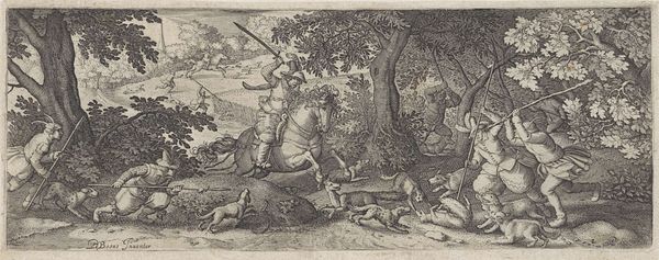 Editor: This is Philips Serwouters' "Hertenjacht," made sometime between 1601 and 1650. It's an engraving of a deer hunt. The frenetic energy really strikes me. The diagonal lines of the spears and the leaping figures create a sense of chaotic motion. What stands out to you, looking at this print? Curator: The composition compels. Note how Serwouters deploys line to construct a dynamic tension between the foreground action and the backdrop. The contrast between the dense, dark etching of the hunters and the relatively open space surrounding the deer creates a compelling focal point. Do you observe how the lines direct the eye? Editor: I see what you mean. The spears point right at the deer, leading your eye across the print. The stark contrast between the dark figures and the light space definitely makes the hunt stand out. The architecture seems less detailed and a bit out of focus. It makes me wonder if the artist is trying to make the background more important. Curator: Precisely. The meticulous rendering of the figures in contrast with the subdued background invites us to consider figure-ground relationships within the pictorial space. Ask yourself: Does the backdrop merely serve as context, or does it offer commentary on the hunters’ actions? Consider the role of the artist himself in depicting class hierarchy through variations in the details used to construct a more "elevated" composition. Editor: That's a good point. So, the emphasis on form and composition suggests an artist commenting on power and perspective in the hunting scene? Curator: Indeed. Through an acute manipulation of formal elements—line, tone, spatial arrangement—the artist provides visual clues to deeper inquiries of societal dynamics of this early modern moment. Editor: Thank you for that explanation, I will start analyzing the relationships between foreground and background more often in future visits.