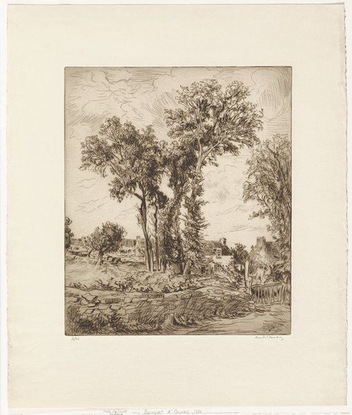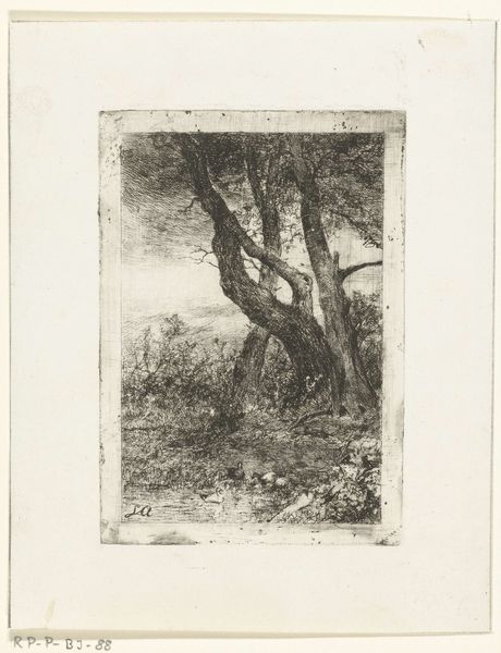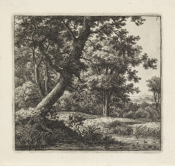 Editor: Here we have Albertus Brondgeest’s “Landscape with Oak Trees and Man near Water,” etched sometime between 1796 and 1849. It feels like such a still and contemplative scene. What strikes you most about the composition of this landscape? Curator: Immediately, the dominance of the oak takes precedence. Its formidable structure fills a significant portion of the pictorial space, directing the viewer's eye through a calculated recession into depth. Notice how Brondgeest employs delicate hatching and cross-hatching to differentiate the textures of the foliage from the smoother surfaces of the water and sky. Editor: The way he uses light and shadow is so subtle. Almost ethereal. Curator: Precisely. The interplay of light, strategically placed, models the forms and generates a palpable atmosphere. Are you observing how the artist juxtaposes the intricacy of the tree's branches against the open expanses? It lends itself to notions of the sublime and the individual's insignificance when facing nature. Editor: So, you see this as less about the actual location and more about Brondgeest exploring these broader philosophical ideas through form? Curator: Indeed. The landscape transcends its representational function. It’s in the contrast, scale and detail that the drawing truly communicates its intention. Can you notice how your eyes are invited into a hierarchy of detail? Editor: Yes, you can really appreciate his use of the etching technique to create these intricate lines, highlighting both the immense scale of the oak, but also that of nature itself. This gives one a very grounded feeling about this very moving work. Curator: I concur; an engagement with Romantic ideals and picturesque design are certainly embodied.
