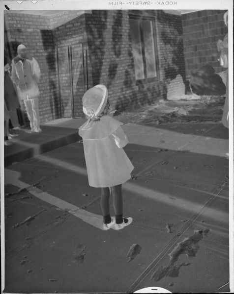 Curator: This photograph, "Untitled (woman with little girl on snowy sidewalk)," comes to us from Lucian and Mary Brown. It’s a gelatin silver print. Editor: It strikes me as a very quiet, almost unsettling composition. The stark contrast and the figures’ postures create a palpable sense of unease. Curator: Note how the Browns frame the subjects, the figures on the periphery almost ghostlike, creating a spatial tension that destabilizes the familiar comfort of domesticity. Editor: Absolutely. It feels like a commentary on societal expectations placed on women, particularly regarding motherhood, casting a stark light on its isolating aspects. Curator: Indeed, the tonal range and silver gelatin give the image a formal rigor and emotional depth far exceeding its modest size. Editor: The Browns leave us with a powerful depiction of the complexities inherent in these relationships. Curator: The image has a resonating structure beyond its immediate depiction. Editor: I am interested in how the subjects are being framed within a cultural context.