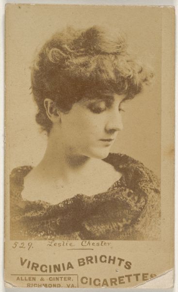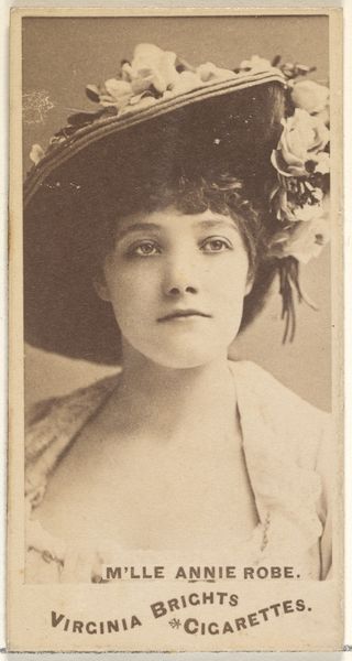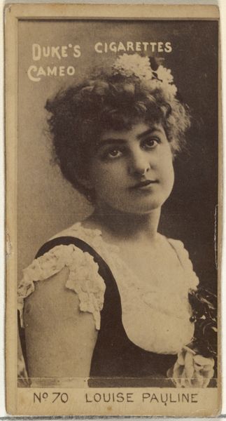 This is a promotional cigarette card of Lillian Russell, the darling of the American musical theatre, produced by Kinney Brothers, sometime in the late 19th century. These cards were collected and traded, offering glimpses into the desires and values of the Gilded Age. Russell, known for her beauty and voluptuous figure, became a symbol of feminine allure, but also of independence, as one of the first women who was financially autonomous. This image is not just a portrait, but a carefully constructed commodity, designed to sell an image of glamour and success along with a pack of Sweet Caporal cigarettes. The lace, the elaborate hat, the soft lighting, all speak to a certain kind of idealized femininity, one that was both admired and, perhaps, subtly policed during the time. While it reflects a certain societal standard, Russell's confident gaze hints at a complex negotiation of identity, one where she is both subject and object of the viewer's desire. Consider how this image, mass-produced and widely circulated, helped to shape and reflect America’s evolving notions of beauty, fame, and femininity.